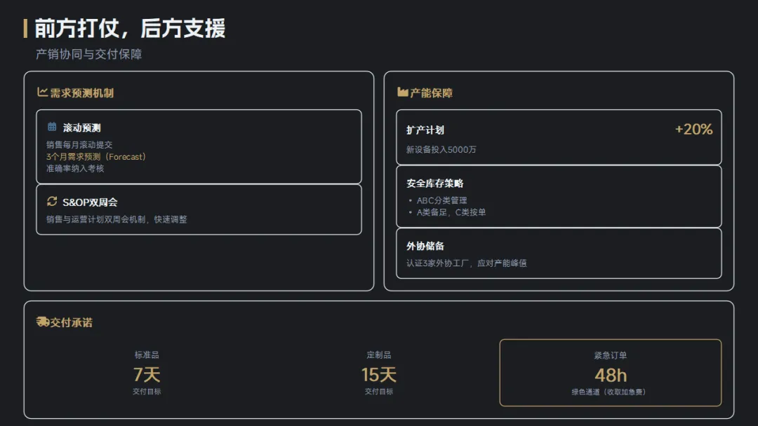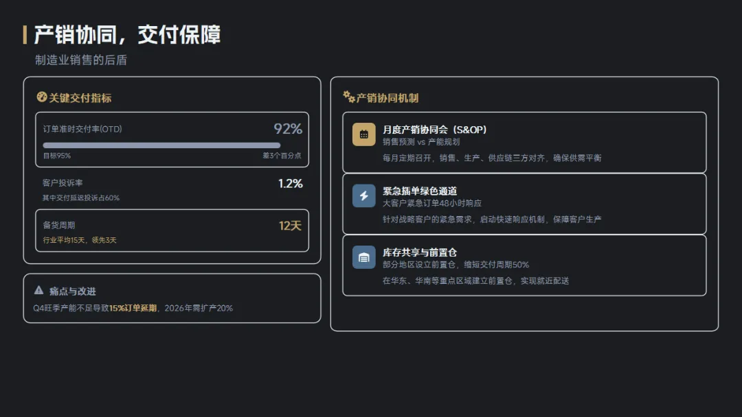 - 产销协同必须前置:需求预测与产能规划需提前对齐,不能等到旺季再想办法。