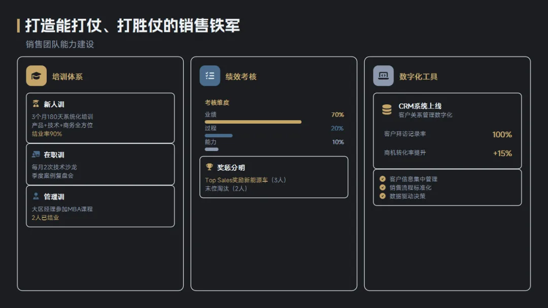 - 人才培养梯队必须系统化:不能只看眼前业绩,要着眼未来3年的人才储备。
