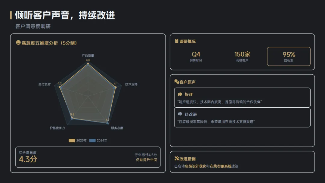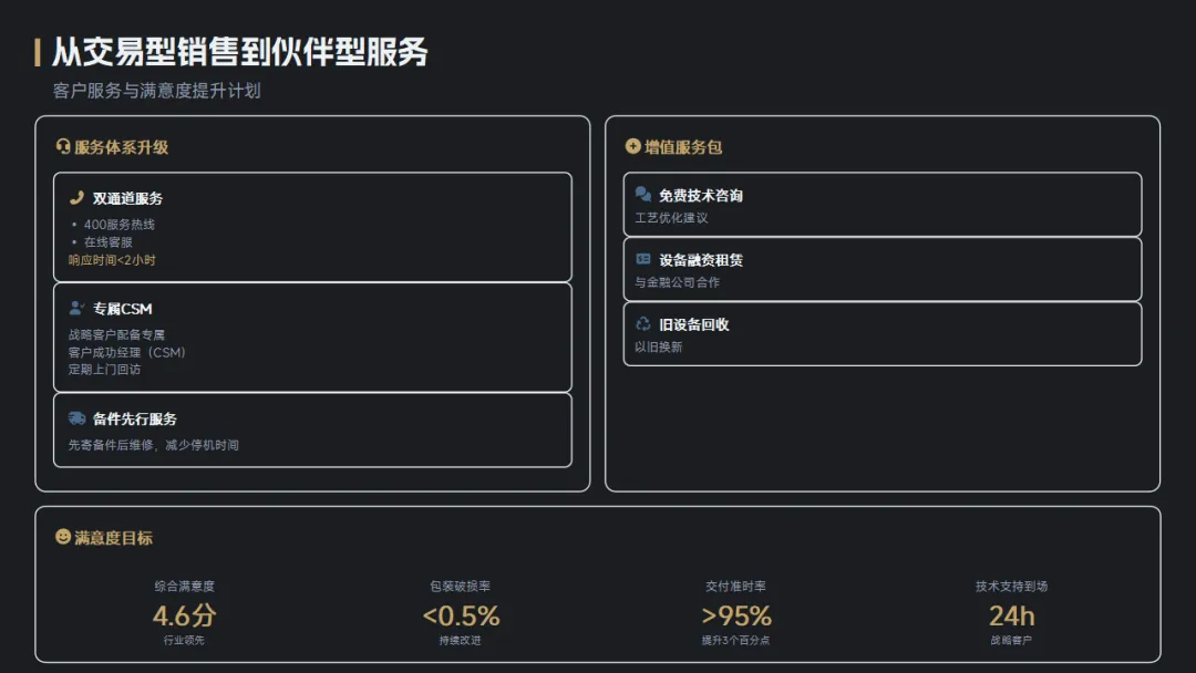 内容营销:发布技术白皮书、行业报告(Lead Magnet)。PR策略:在行业媒体开设专栏,包装标杆客户案例(成功故事)。从交易型销售到伙伴型服务——客户服务与满意度提升计划双通道服务:400服务热线+在线客服,响应时间<2小时。专属CSM:战略客户配备专属客户成功经理(CSM),定期上门回访。- 客户360度视图:整合订单记录、回款记录、服务记录、互动记录。
