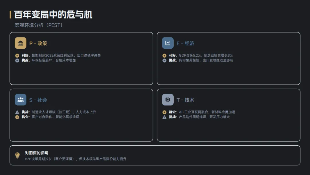 在制造业转型升级的浪潮中,我们抓住了机遇,但内功仍需修炼!2026年的战略必须建立在对宏观环境的深刻洞察之上。我们用PEST模型来分析:利好:智能制造2025政策红利延续,出口退税率调整有利于我们拓展海外。挑战:环保标准趋严,合规成本增加。我们必须加大绿色制造投入。利好:GDP增速5.2%,制造业投资增长8%,大环境仍然支持增长。挑战:内需复苏缓慢,出口受地缘政治影响存在不确定性。挑战:制造业人才短缺(技工荒),人力成本持续上升。机会:客户对自动化、智能化需求迫切,这正是我们的机会。机会:AI+工业互联网融合,新材料应用加速,我们可以在这些领域突破。挑战:产品迭代周期缩短,研发压力增大,必须加快创新速度。对销售的影响:B2B决策周期拉长(客户更谨慎),但技术领先型产品溢价能力提升。目标市场(中高端)240亿元,我司市占率5.3%,仍有巨大提升空间。- 进口替代加速:国产替代率从40%提升至60%,高端领域突破机会巨大。