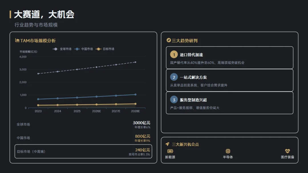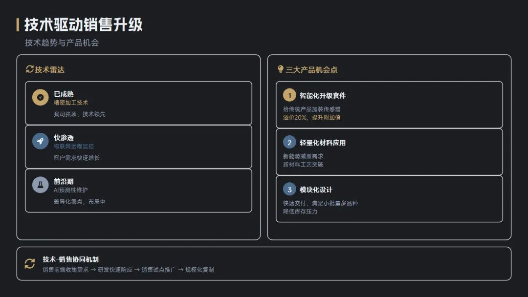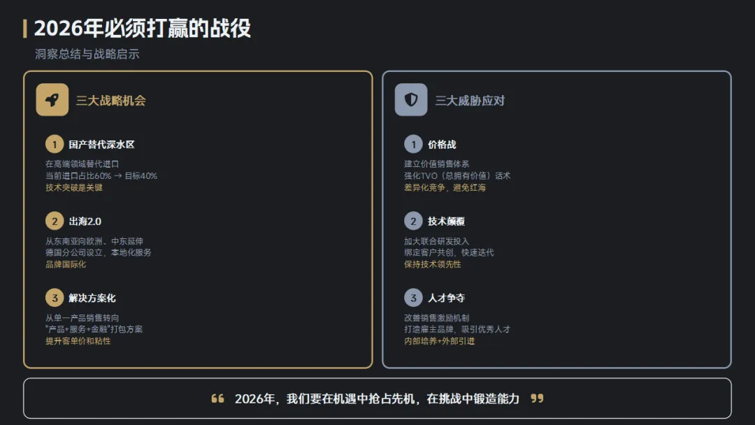 技术-销售协同机制:销售前端收集需求 → 研发快速响应 → 销售试点推广 → 规模化复制。基于以上洞察,我们识别出三大战略机会和三大威胁应对:- 国产替代深水区:在高端领域替代进口,当前进口占比60%,我们的目标是将其降至40%,技术突破是关键。