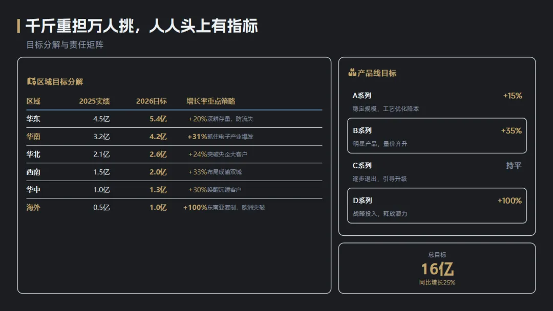 2026年,我们要在机遇中抢占先机,在挑战中锻造能力!稳——稳存量:老客户留存率≥95%,深度挖掘存量价值。提——提质量:解决方案占比提升至30%,中高端产品占比提升。千斤重担万人挑,人人头上有指标——目标分解与责任矩阵- 华东区:2025年4.5亿 → 2026年5.4亿(+20%),策略是深耕存量,防止流失。