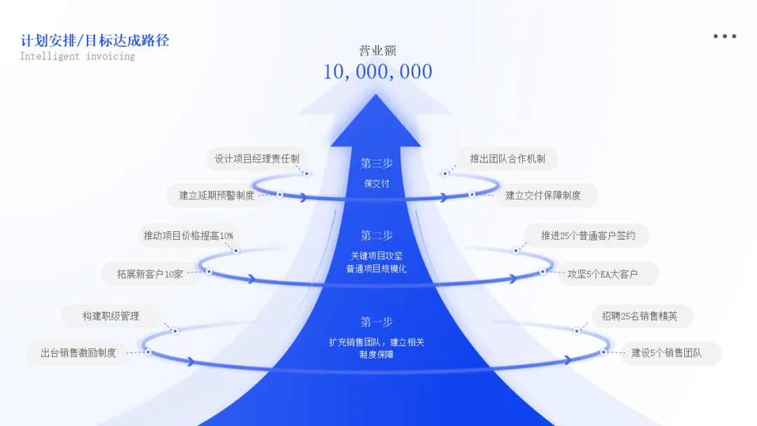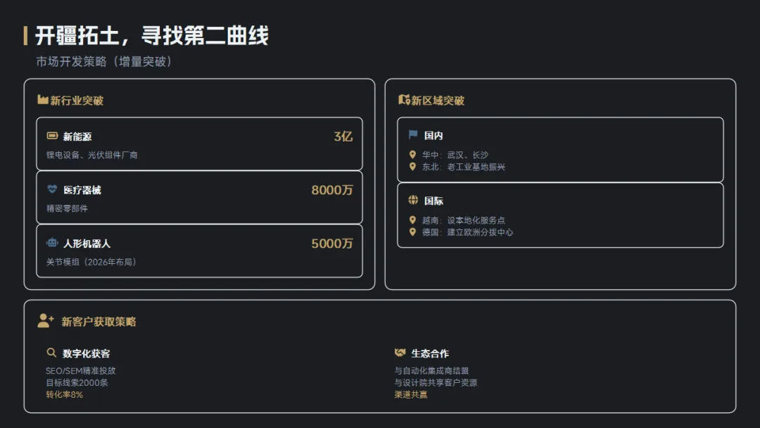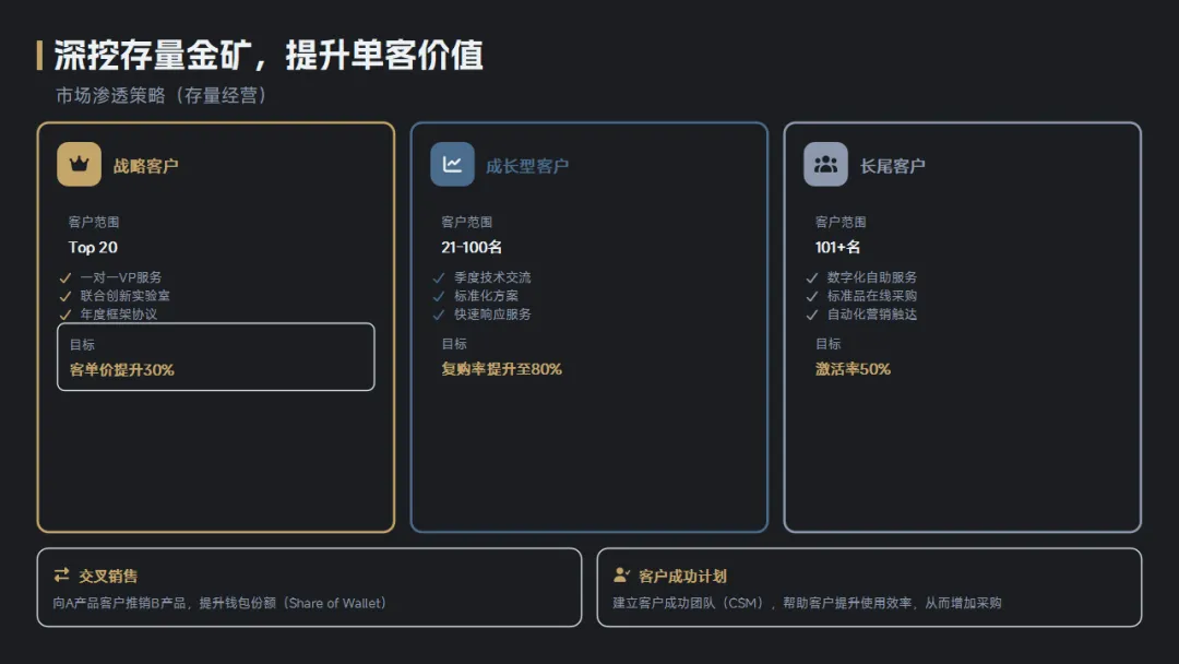 深挖存量金矿,提升单客价值——市场渗透策略(存量经营)提供一对一VP服务,建立联合创新实验室,签订年度框架协议。目标:客单价提升30%。提供季度技术交流,标准化方案,快速响应服务。目标:复购率提升至80%。提供数字化自助服务,标准品在线采购,自动化营销触达。目标:激活率50%。交叉销售策略:向A产品客户推销B产品,提升钱包份额(Share of Wallet)。客户成功计划:建立客户成功团队(CSM),帮助客户提升使用效率,从而增加采购。开疆拓土,寻找第二曲线——市场开发策略(增量突破)- 新能源:目标3亿,重点开发锂电设备、光伏组件厂商。