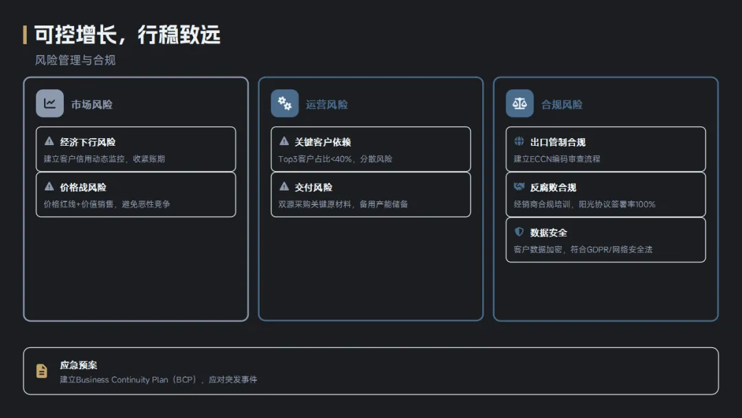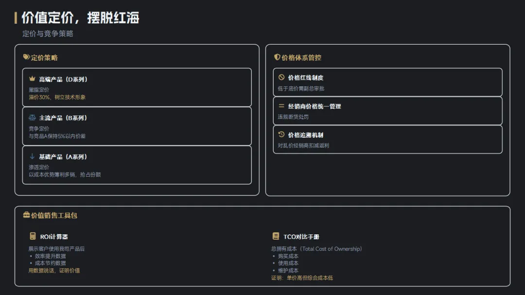- 价格战威胁:建立价值销售体系,强化TVO(总拥有价值)话术,差异化竞争,避免陷入红海。