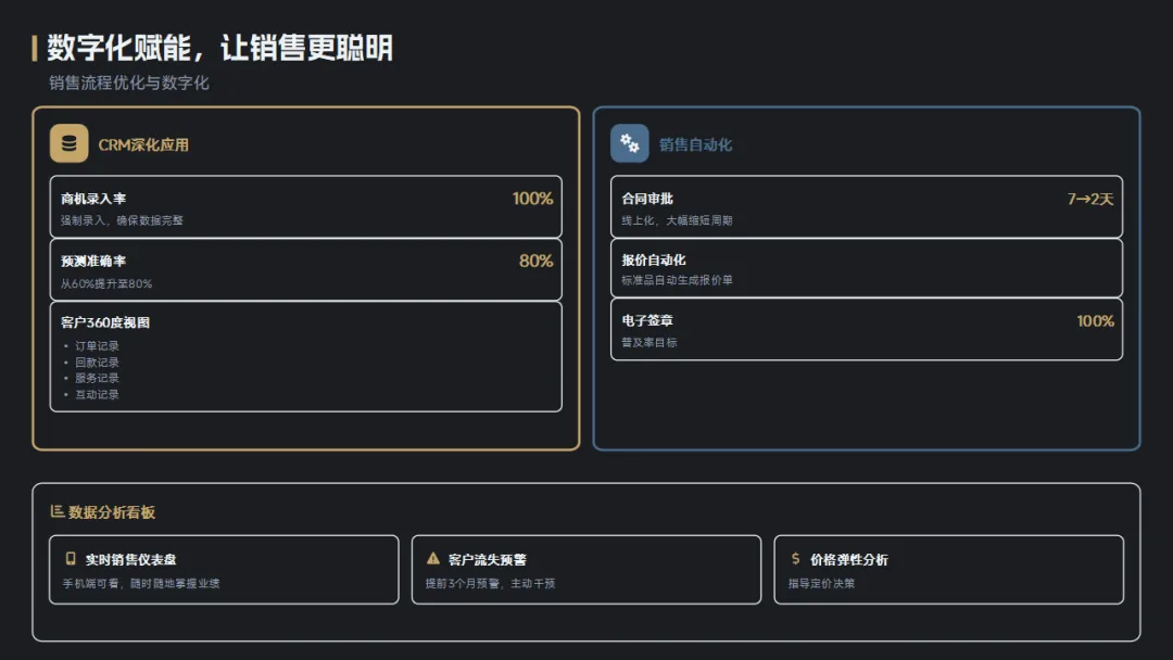- 解决方案化:从单一产品销售转向"产品+服务+金融"打包方案,提升客单价和粘性。