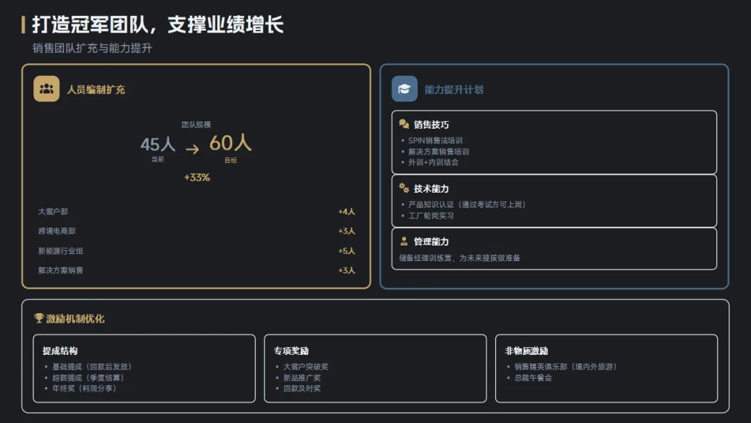 - 人才争夺威胁:改善销售激励机制,打造雇主品牌,吸引优秀人才,内部培养+外部引进。