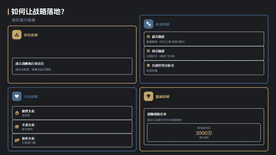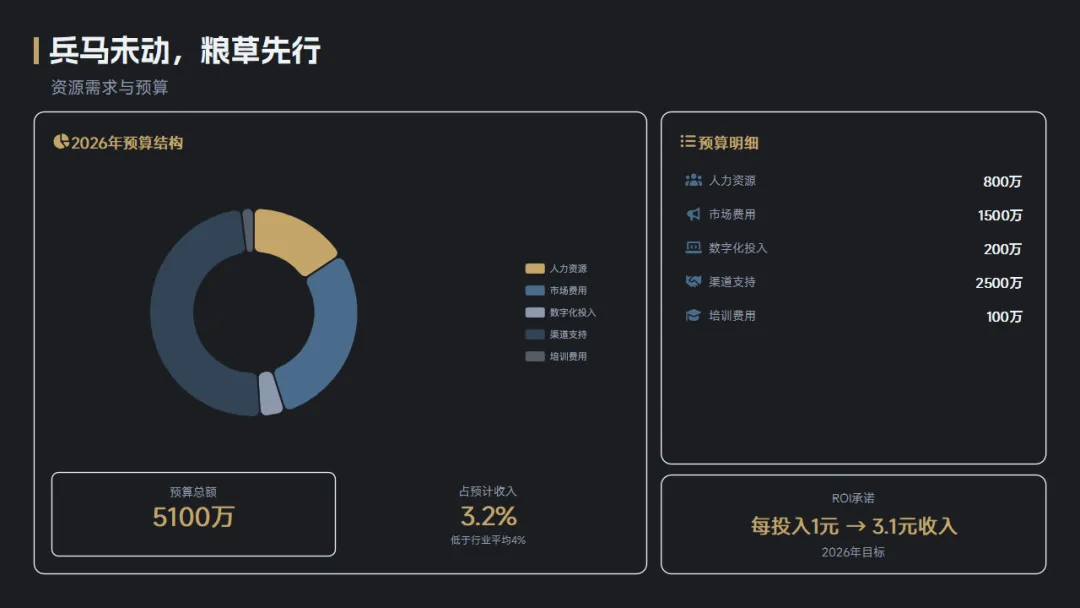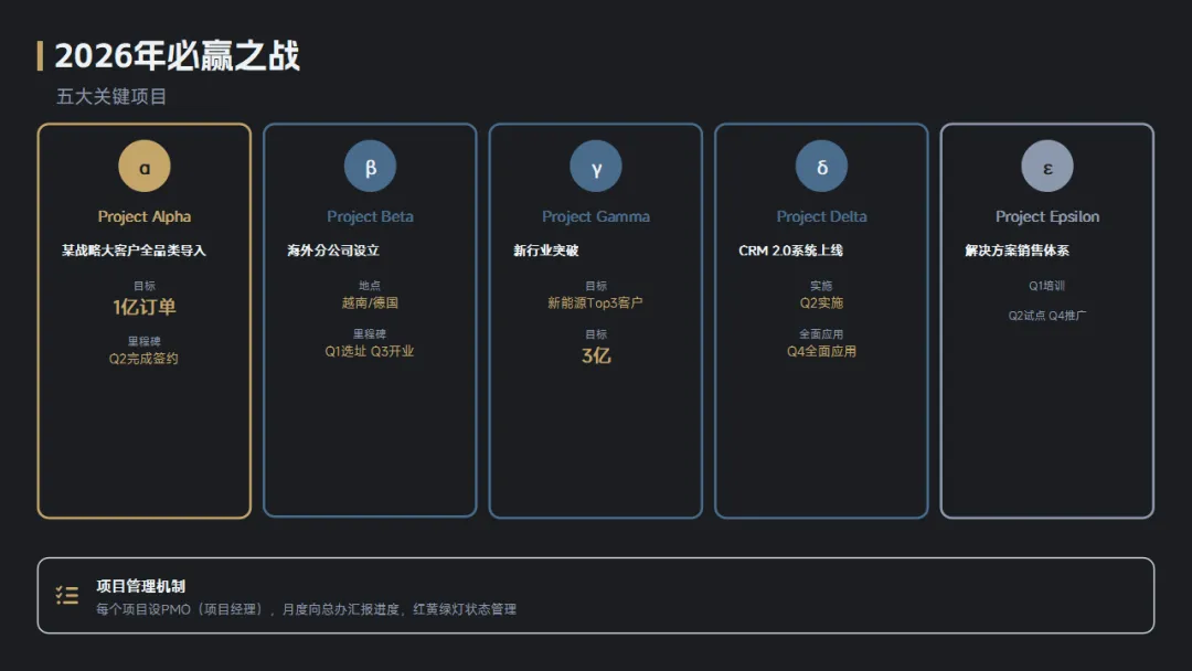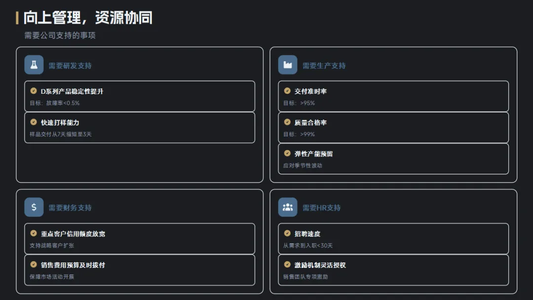 打造冠军团队,支撑业绩增长——销售团队扩充与能力提升销售技巧:SPIN销售法培训、解决方案销售培训,外训+内训结合。技术能力:产品知识认证(通过考试方可上岗),工厂轮岗实习。提成结构:基础提成(回款后发放)+ 超额提成(季度结算)+ 年终奖(利润分享)。非物质激励:销售精英俱乐部(境内外旅游)、总裁午餐会。滚动预测:销售每月滚动提交3个月需求预测(Forecast),准确率纳入考核。S&OP双周会:销售与运营计划双周会机制,快速调整。扩产计划:推动生产端扩产20%,新设备投入5000万。安全库存策略:ABC分类管理,A类备足,C类按单。关键客户依赖:确保Top 3客户占比<40%,分散风险。反腐败合规:经销商合规培训,阳光协议签署率100%。数据安全:客户数据加密,符合GDPR/网络安全法。建立Business Continuity Plan(BCP),应对突发事件。2026年我们将重点推进五个战略级项目,代号α、β、γ、δ、ε:Project Alpha(α项目):某战略大客户全品类导入,目标1亿订单,里程碑Q2完成签约。Project Beta(β项目):海外分公司设立,地点越南/德国,里程碑Q1选址、Q3开业。Project Gamma(γ项目):新行业突破,目标新能源Top 3客户,目标3亿。Project Delta(δ项目):CRM 2.0系统上线,Q2实施、Q4全面应用。Project Epsilon(ε项目):解决方案销售体系,Q1培训、Q2试点、Q4推广。项目管理机制:每个项目设PMO(项目经理),月度向总办汇报进度,红黄绿灯状态管理。预算总额5100万元,占预计收入3.2%,低于行业平均4%。ROI承诺:每投入1元带来3.1元收入(2026年目标)。成立战略执行委员会,实行周例会制度,销售总监负责制。超额利润分享:超过16亿部分的10%奖励团队。若完成18亿,团队奖励2000万。为了完成2026年的目标,我们需要公司层面的支持: