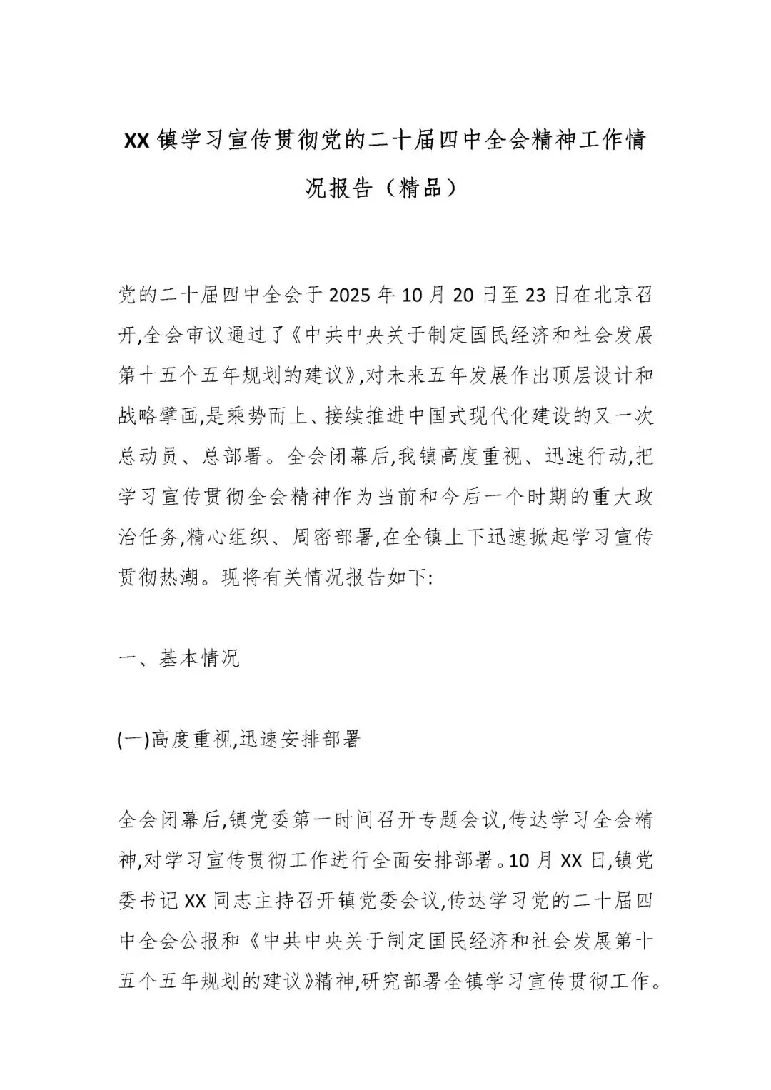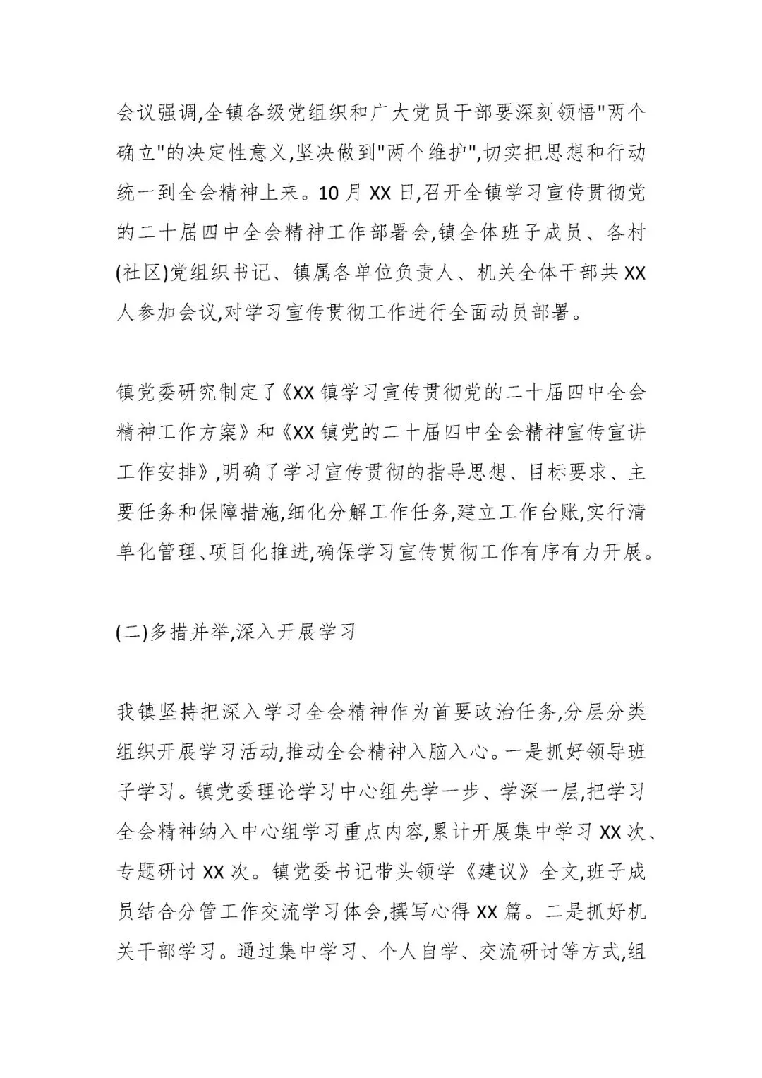 XX镇学习宣传贯彻党的二十届四中全会精神工作情况报告