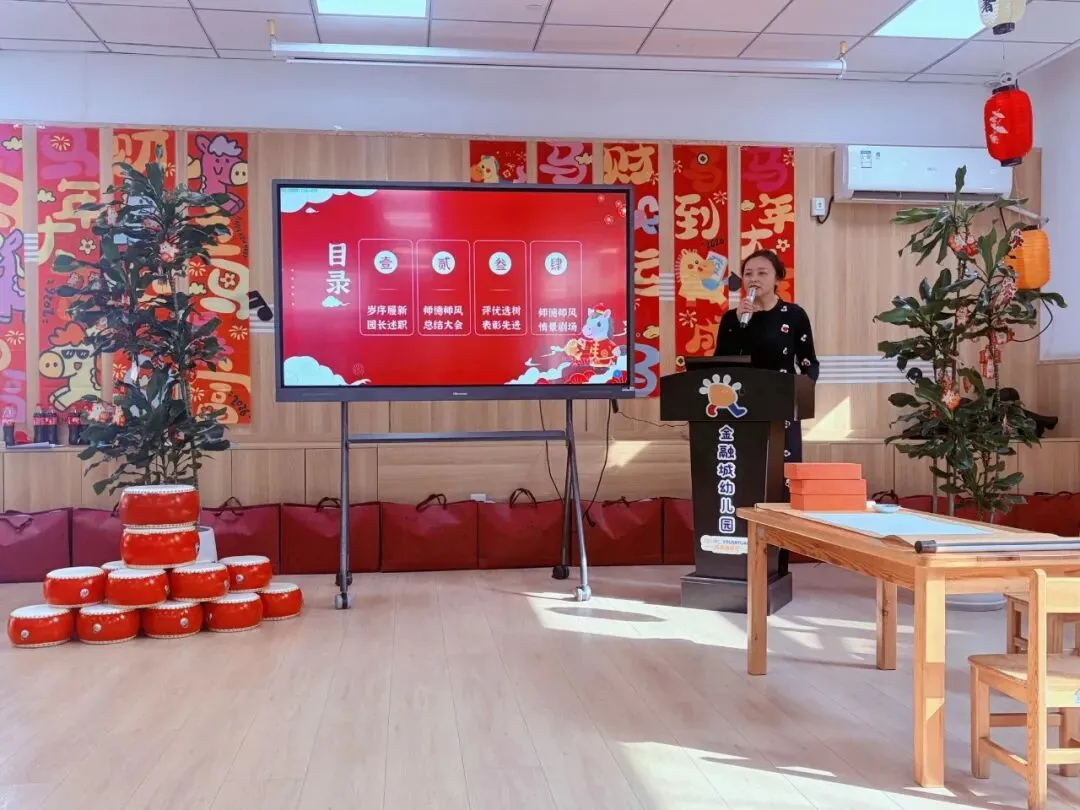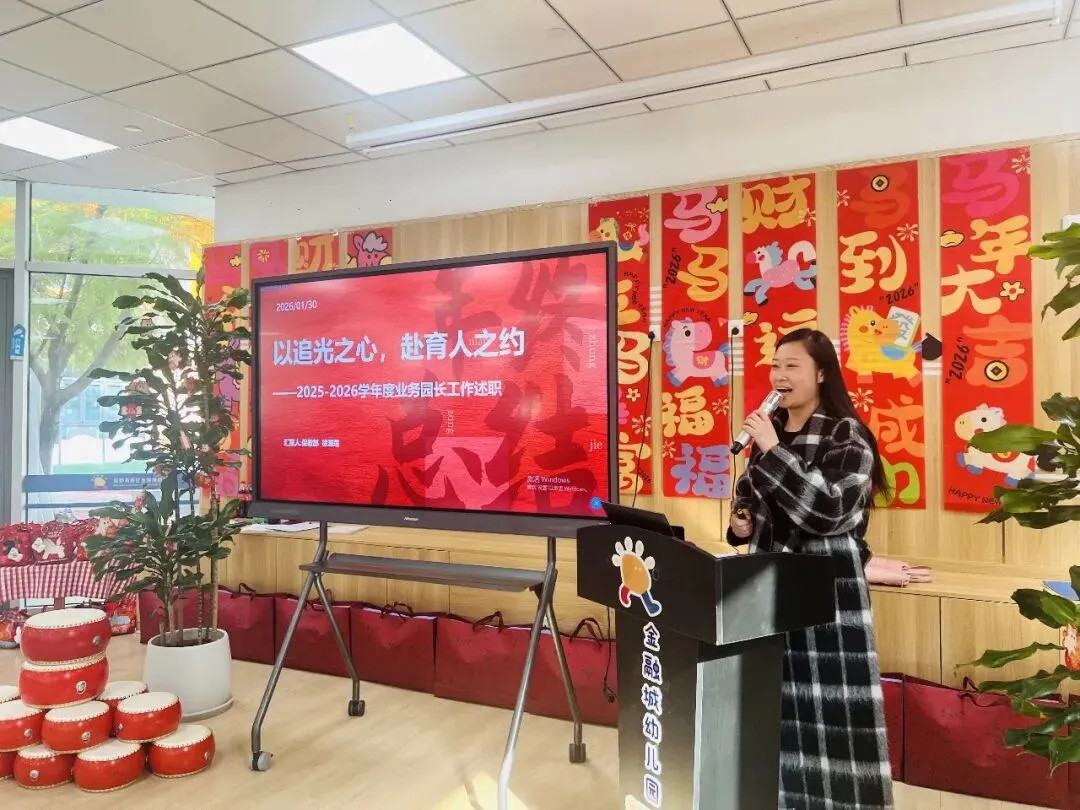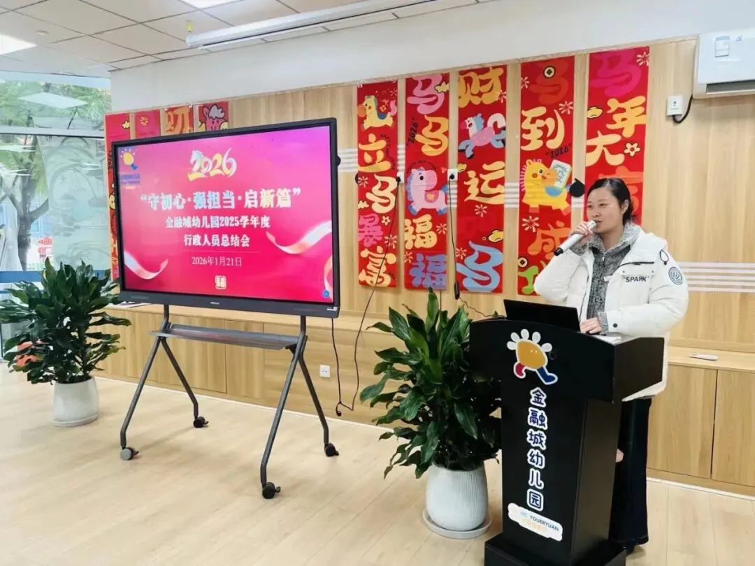 全体行政人员以“守初心·强担当·谱新篇”为题,对本学期的工作情况进行述职,覃园长在开场致辞中表示:本年度金融城幼儿园管理团队,紧扣园所发展目标,高效协同、履职尽责。办公室、保教、后勤、保健、财务等行政人员从自身岗位出发,结合自己在管理工作中的成长经历,总结亮点,挖掘不足,并初步拟定未来工作目标。