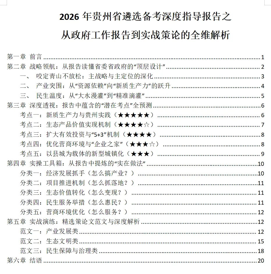 本篇报告把2026年贵州省政府工作报告掰碎了、揉烂了,为大家提炼出最核心的发展方向、最隐蔽的潜在考点、最实用的工作做法,并手把手教大家怎么把这些素材转化为高分策论。我们会减少那些花里胡哨的形容词,用最朴实、最直接的语言,带大家走一遍从“读懂政策”到“写好文章”的完整闭环。