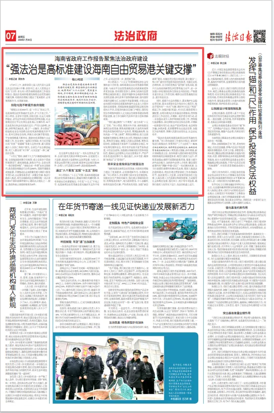 “强法治是高标准建设海南自由贸易港的关键支撑。”刘小明在政府工作报告中指出,要坚持依法行政强法治,统筹用好“三个立法权”(一般地方性法规制定权、经济特区法规制定权、海南自由贸易港法规制定权),聚焦重点领域、涉外领域、新兴领域推进立法,加快构建与国际高标准经贸规则相衔接的法规制度体系,规范行政权力运行,持续营造稳定透明可预期的政策环境。要着力提升涉外法治能力,加快涉外法律人才培养,健全国际商事纠纷“调解+仲裁+诉讼”一站式解决机制,全力打造国际商事纠纷解决优选地。要深入推进法治政府建设,将法治理念贯穿政府工作各领域各环节,依法接受人大监督,自觉接受政协民主监督,认真办理人大代表建议和政协提案,主动接受社会和舆论监督,强化审计、统计等专项监督,确保行政权力在阳光下运行、在法治轨道上运行。