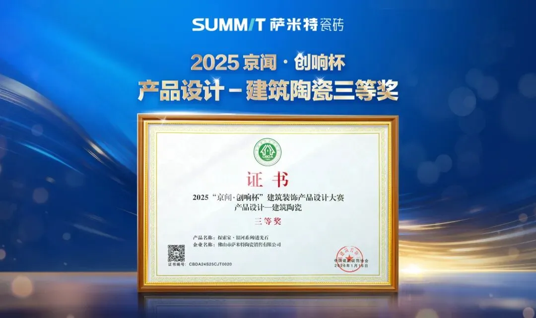 近日,萨米特瓷砖探索家・银河系列凭借卓越的产品表现力,在全国人大会议中心举办的2026建筑装饰材料流行趋势发布大会暨2025京闻・创响杯建筑装饰产品设计大赛颁奖典礼上,荣耀摘得“产品设计 - 建筑陶瓷三等奖”。