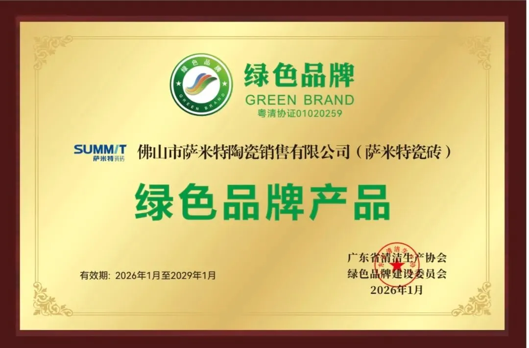 1月7日,广东省清洁生产协会换届大会暨第九届广东绿色低碳与清洁生产大会在广州召开,萨米特瓷砖凭借在绿色制造与绿色产品创新领域的卓越表现,荣获大会颁发的“绿色品牌产品”荣誉证书,绿色发展成果再次获省级权威认可。