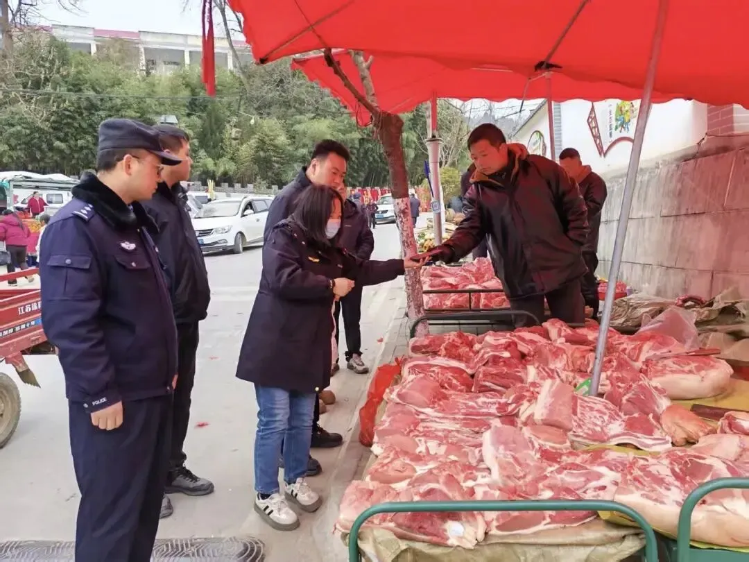镇值班领导带队检查各村值班值守、主动创稳等工作,同时联和派出所、镇市场监督管理所对辖区肉制品销售摊点进行安全检查