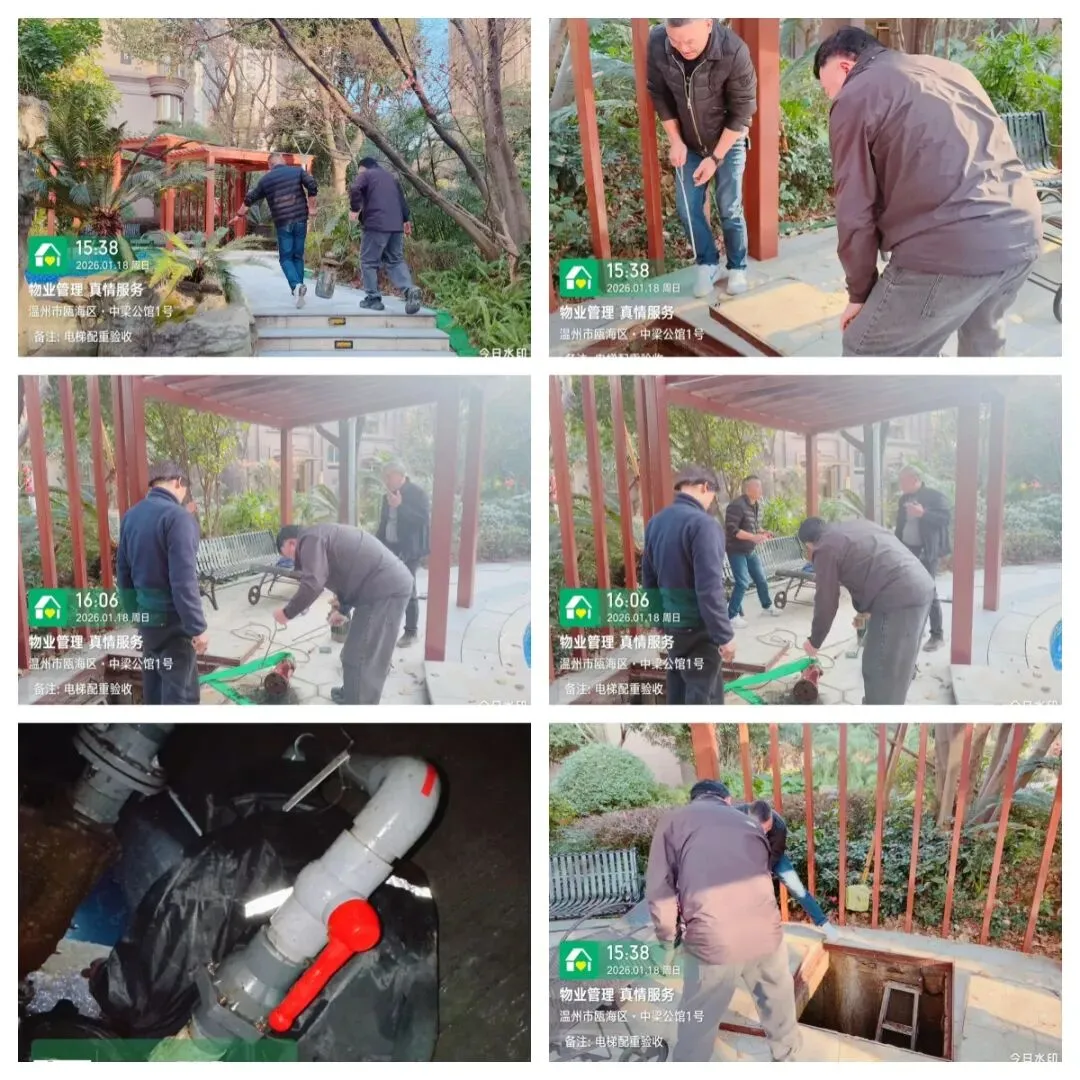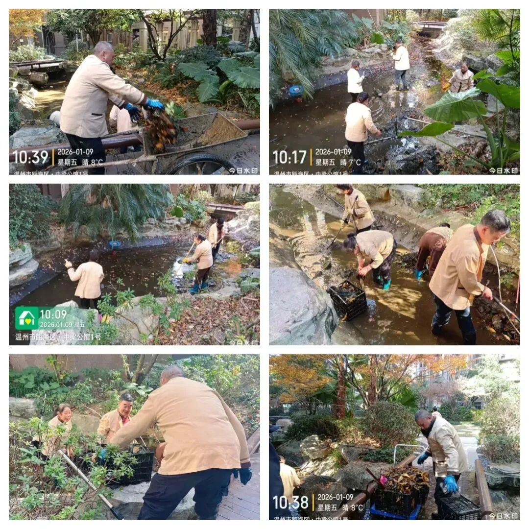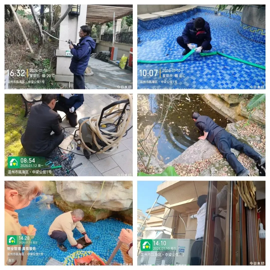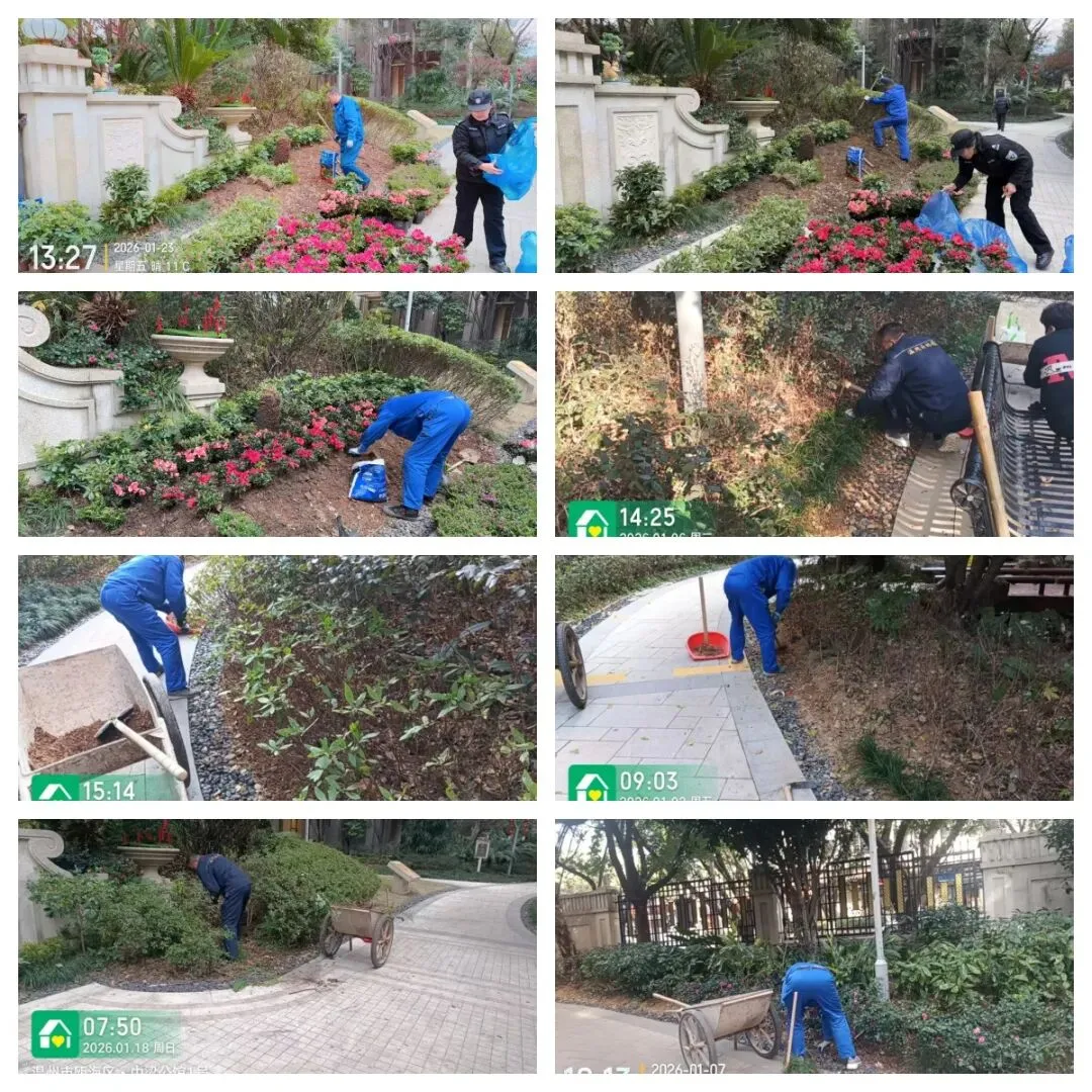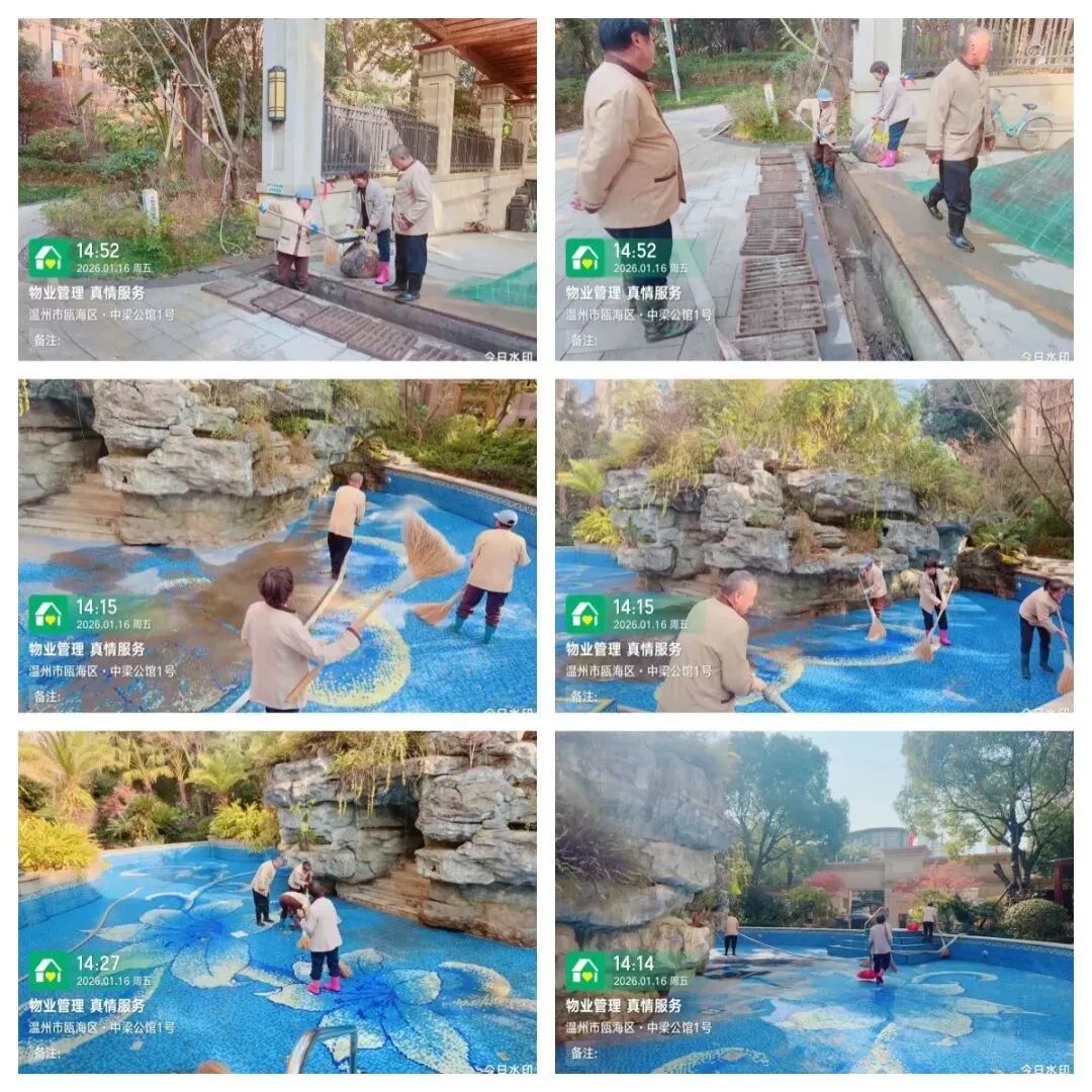 秩序部日常违停自行车处理、河道落叶、帮助业主挑衣物、污水管处理 为了保持小区整洁美观,我们定期对地下室、楼道、电梯轿厢、入户厅、