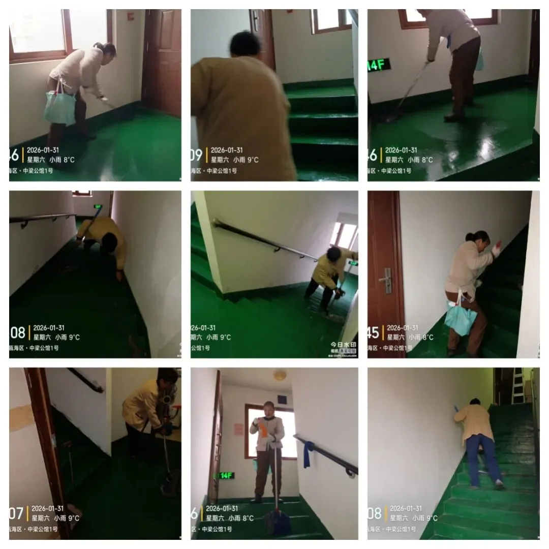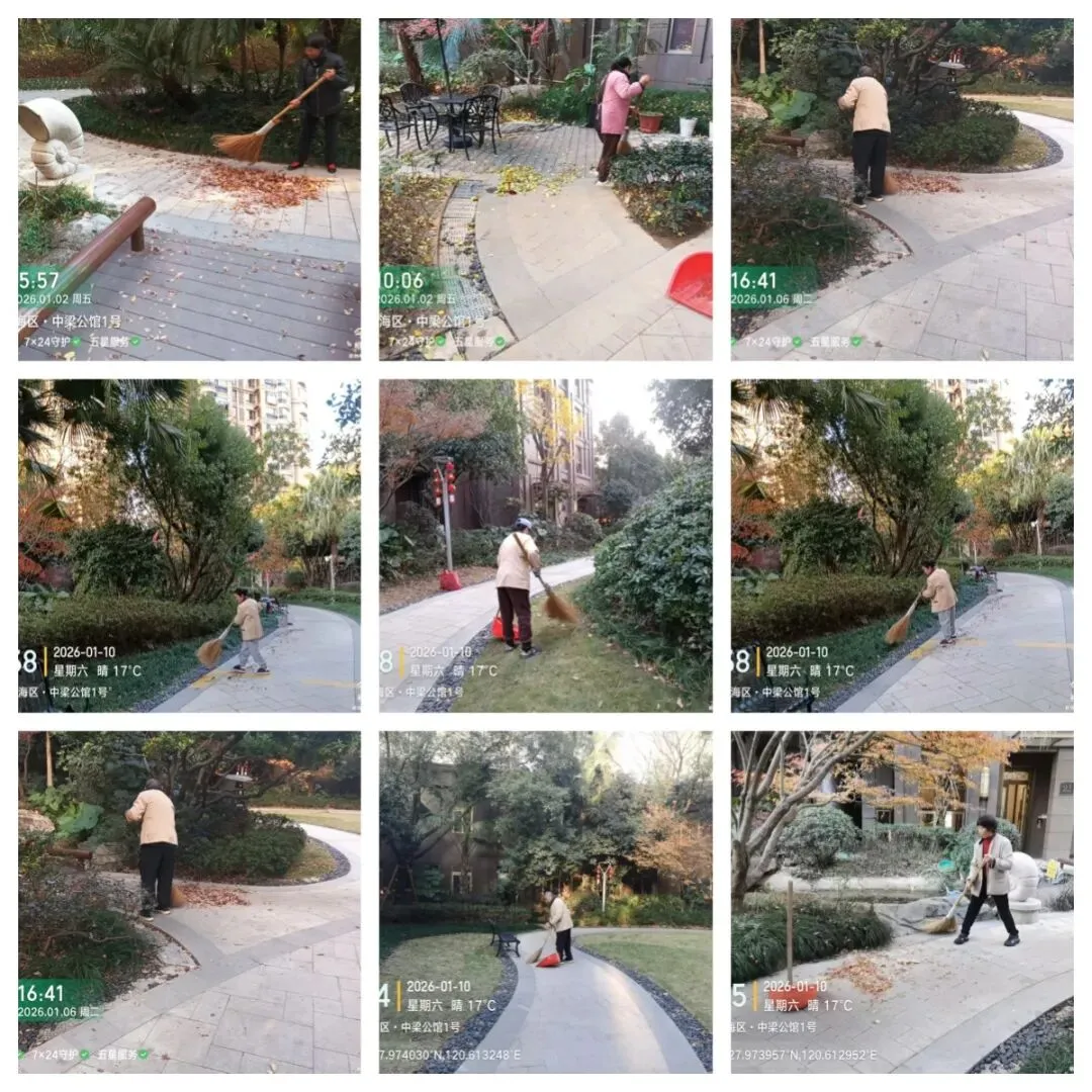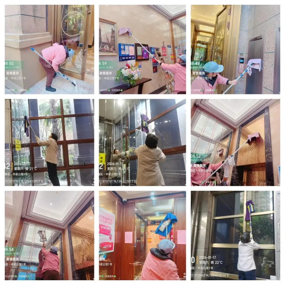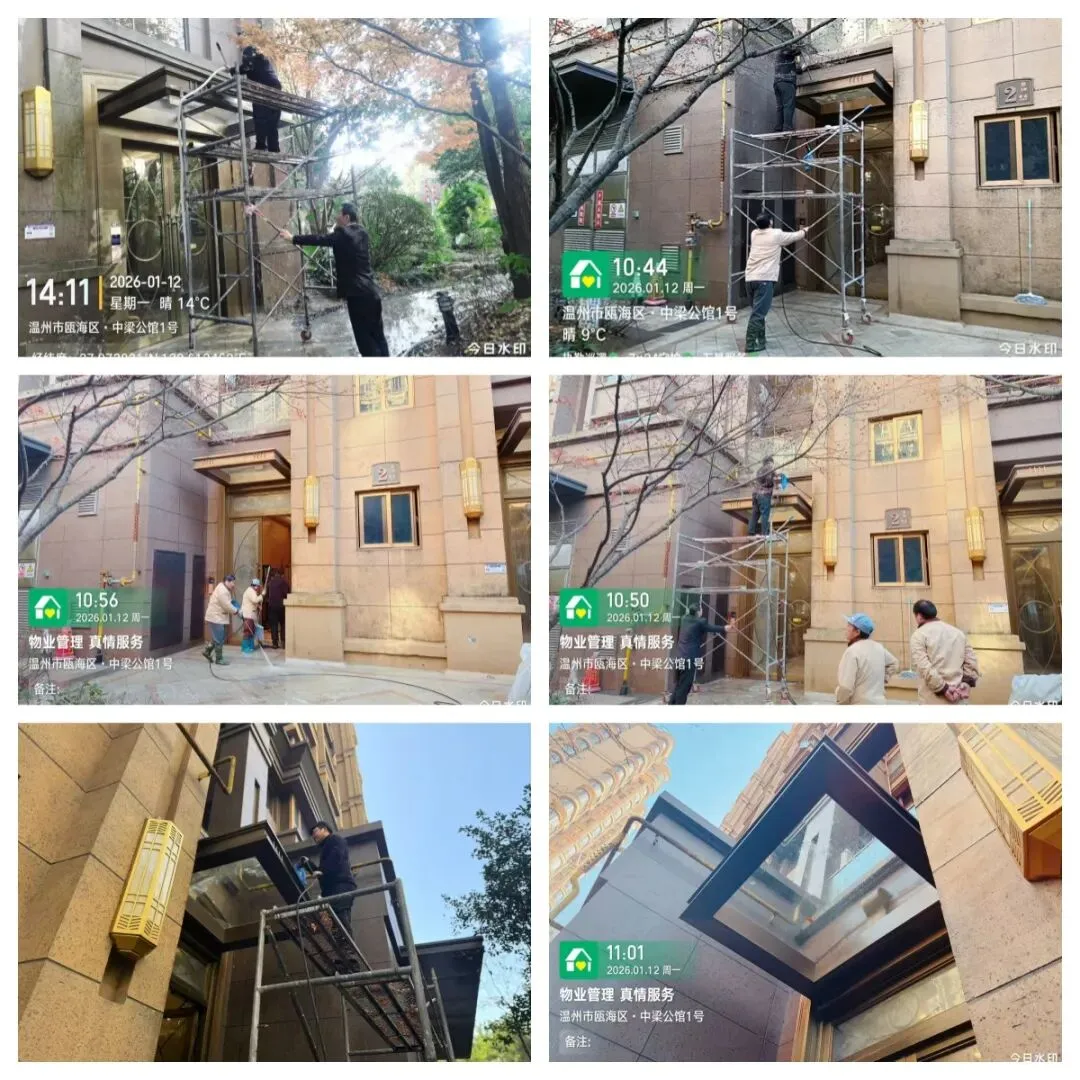 秩序部日常违停自行车处理、河道落叶、帮助业主挑衣物、污水管处理 为了保持小区整洁美观,我们定期对地下室、楼道、电梯轿厢、入户厅、