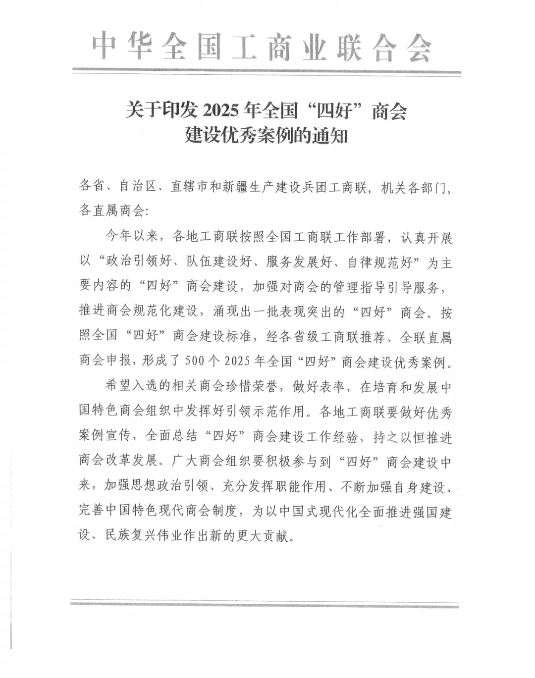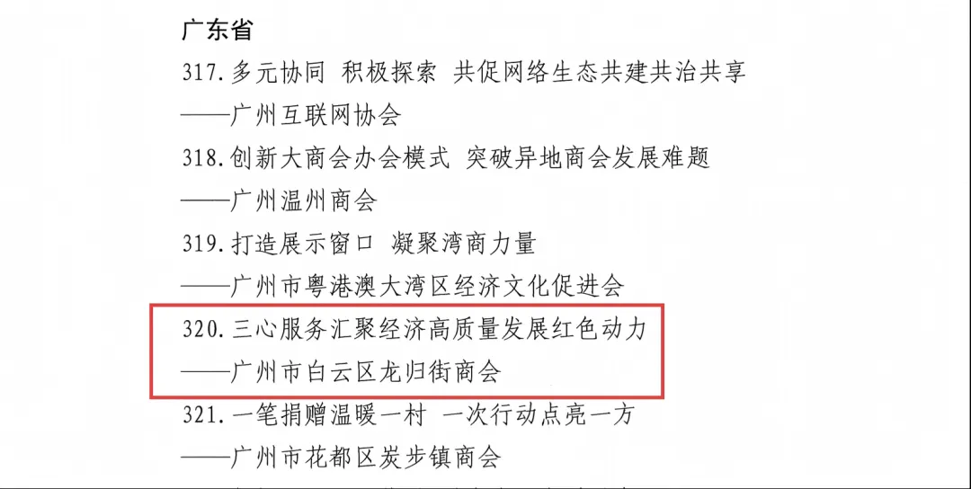 2026年1月,中华全国工商业联合会印发《关于印发2025年全国“四好”商会建设优秀案例的通知》,广州市白云区龙归街商会工作案例《“三心”服务 汇聚经济高质量发展“红色动力”》成功入选全国“四好”商会建设优秀案例。
