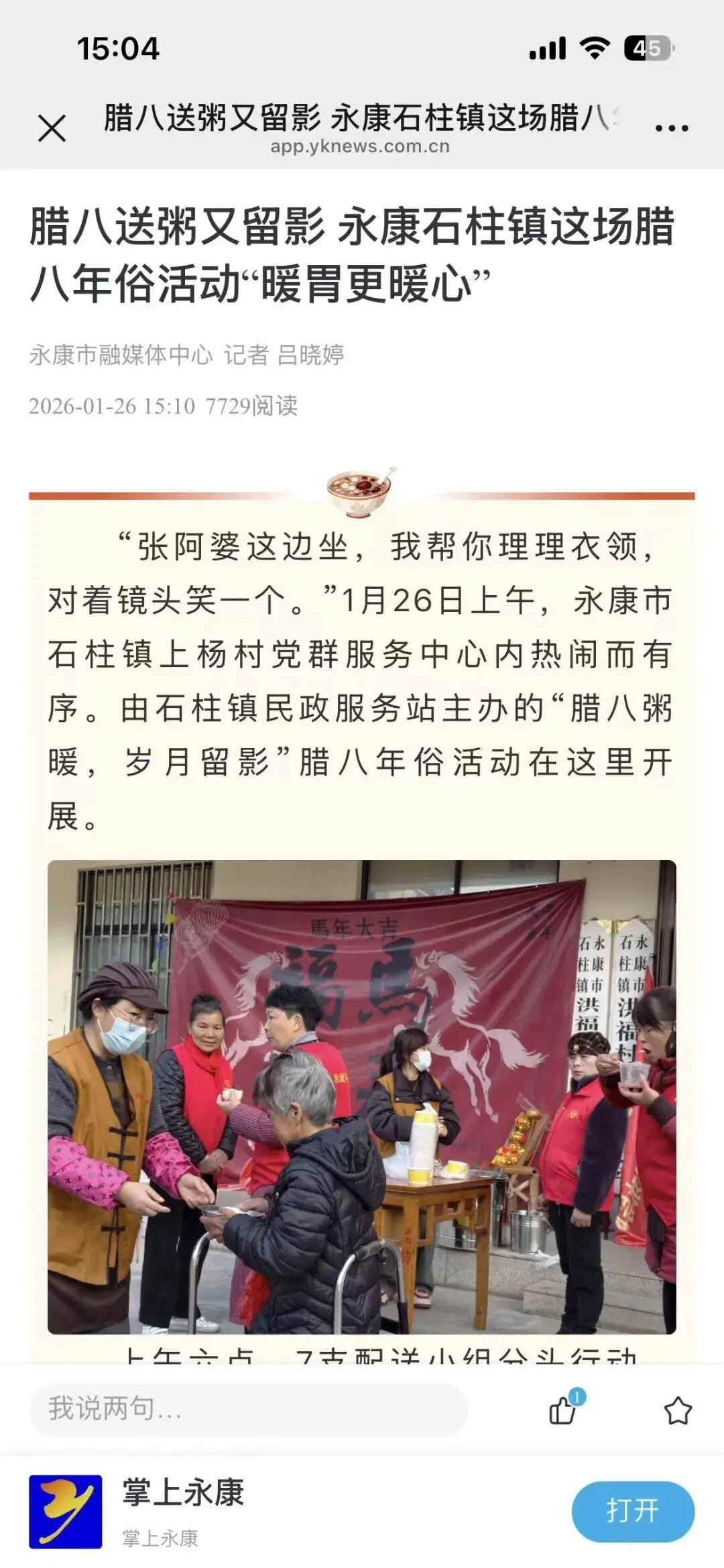 1月26日,腊八节是中国传统节日,寓意团圆与温暖。老年人群体常面临社交单一、情感关怀不足等问题,特别是困境老人。民政服务站携手石柱镇民宗所和洪福寺等单位,开展了“腊八粥暖,岁月留影”年俗系列活动,本次活动旨在借助传统节日,通过共享腊八粥、创意摄影等形式,为老年人营造节日氛围,传递社会关爱,增强其归属感与幸福感。