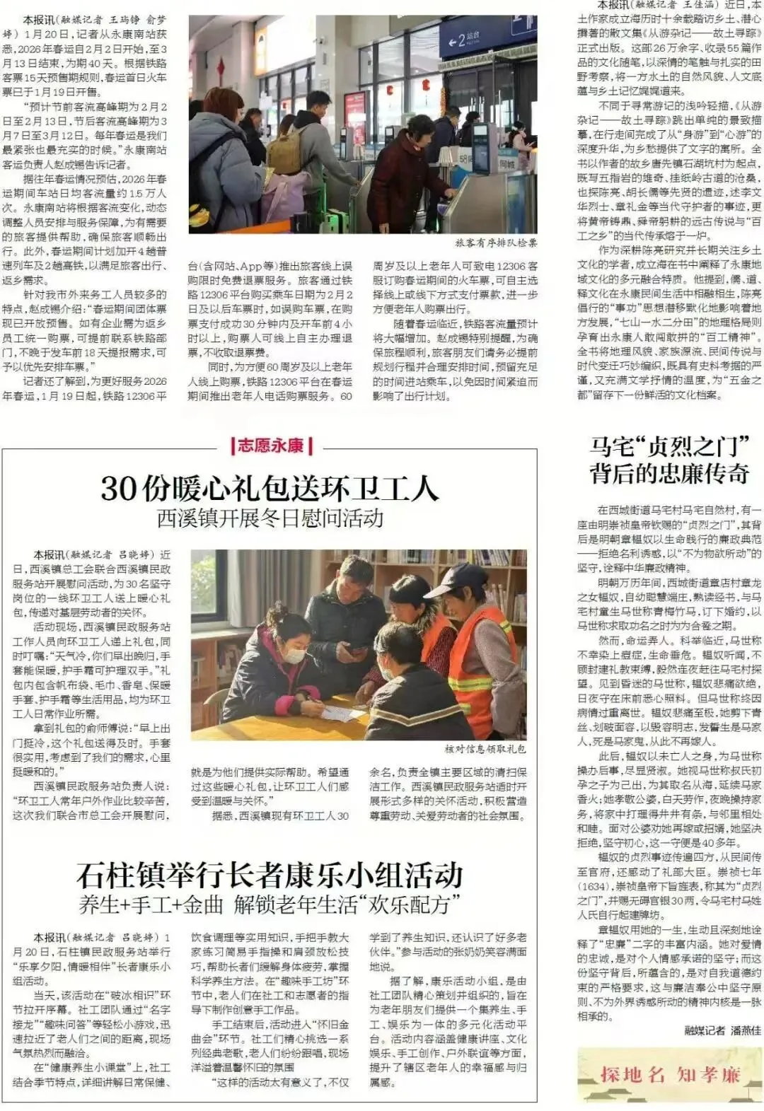 2026年1月,石柱镇民政服务站积极开展各类服务活动,其中:社区活动1场;小组活动开展4节;个案跟进2节;送达幸福清单及探访关爱153户;累计服务281余人次;参与赋能培训1场、督导培训2场;获新闻报道4篇、案例输出1篇;资源链接折合人民币6415元。