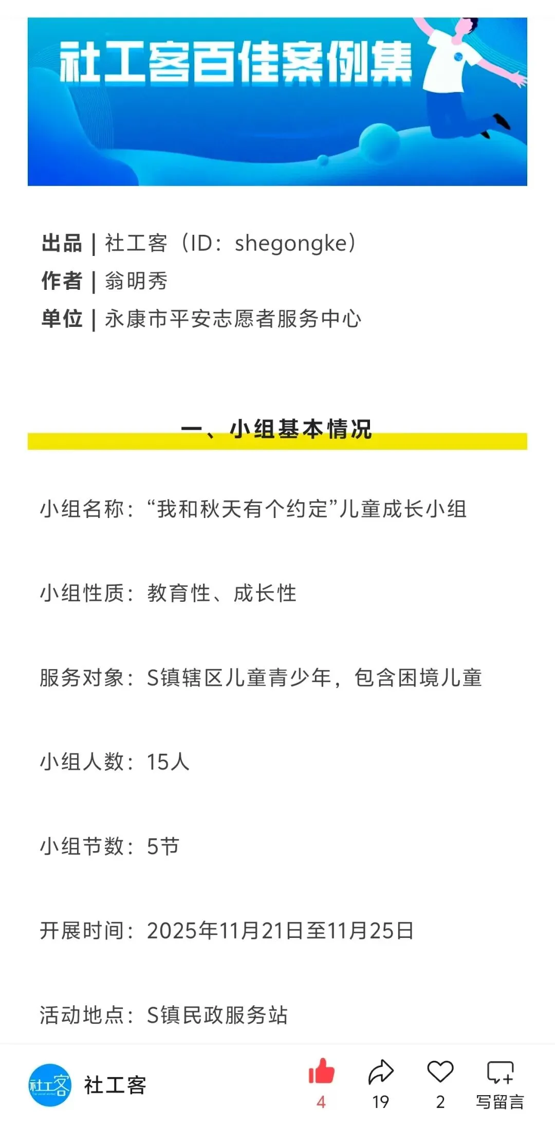 本月石柱镇民政服务站共获得媒体报道4次,案例输出1篇。其中《“我和秋天的约定”儿童成长小组——石柱镇民政服务站社工案例计划》获得社工客案例输出发表。