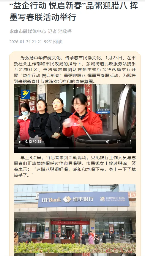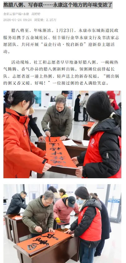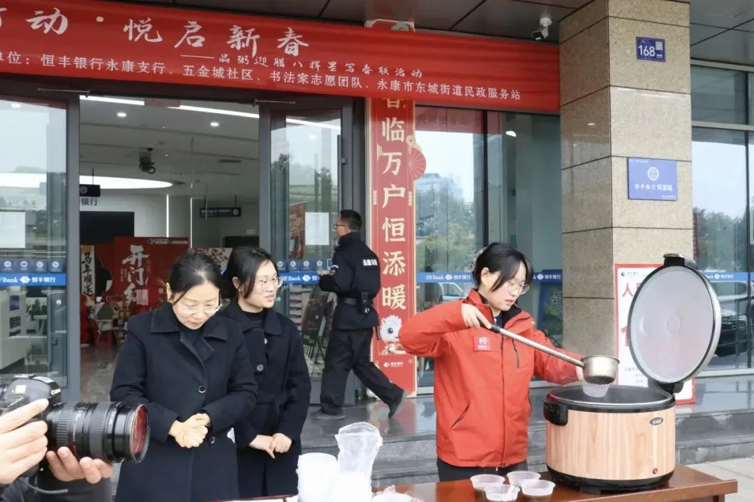 1月23日,永康市东城街道民政服务站联合未保站、助联体,携手五金城社区、恒丰银行金华永康支行及书法家志愿团队,共同开展“益企行动·悦启新春”迎新春主题活动,为社区居民送上近百份腊八粥、400余份手写春联。