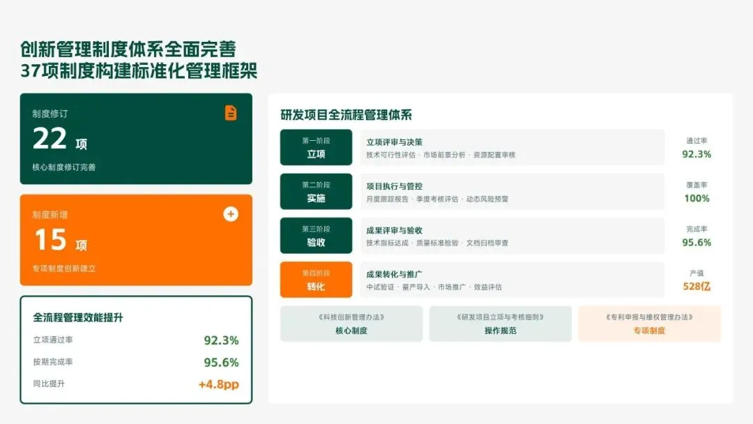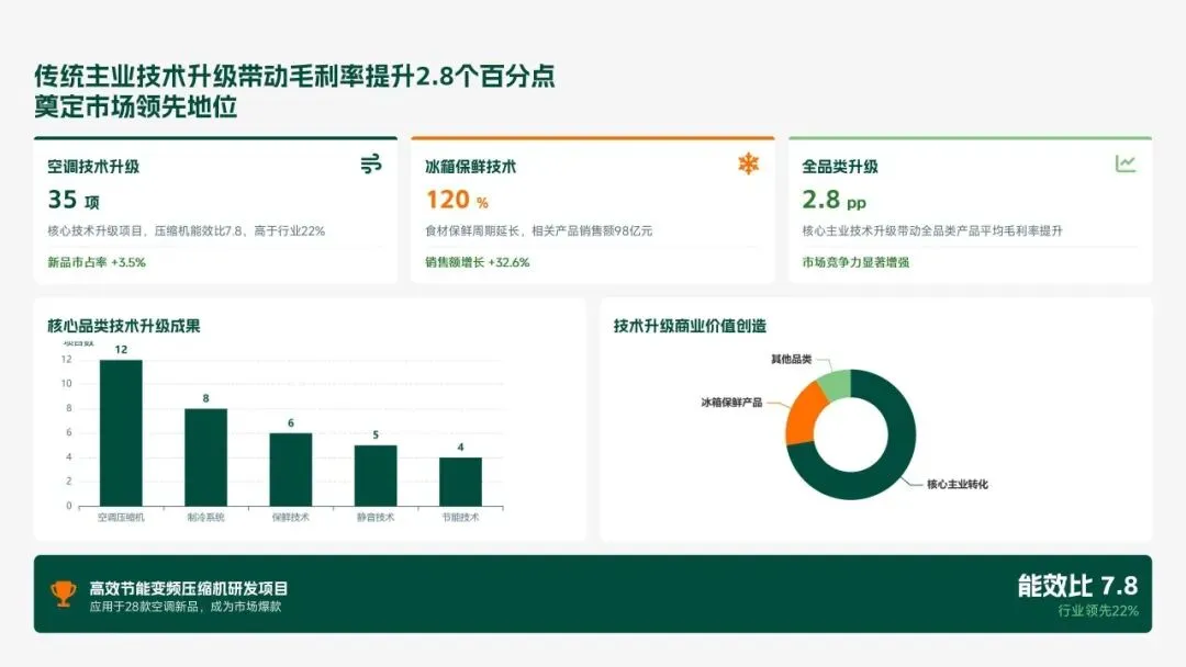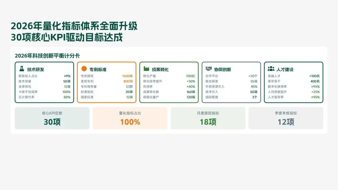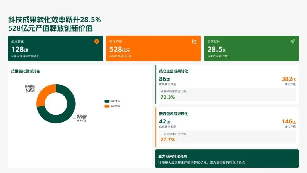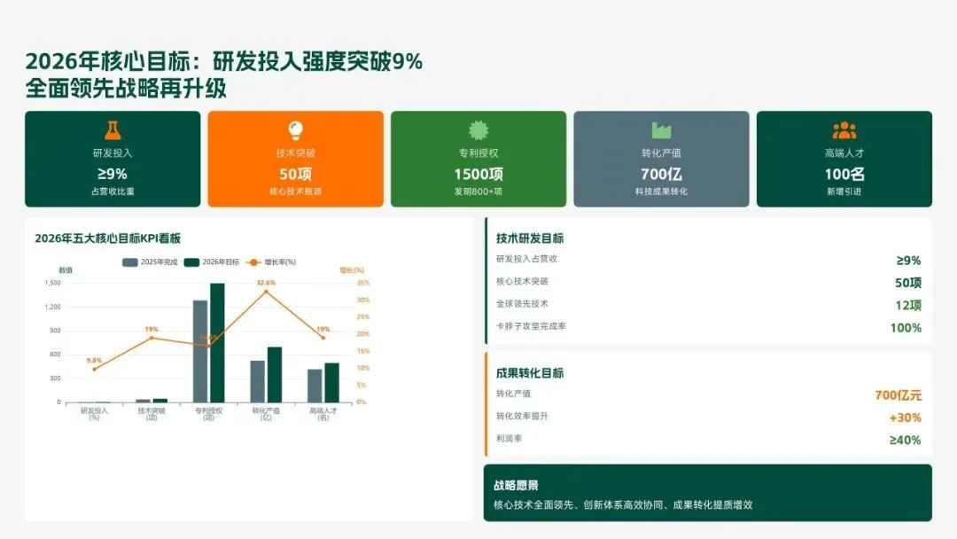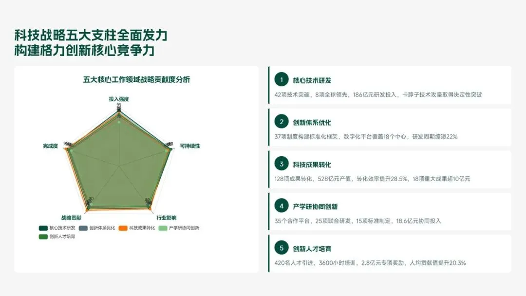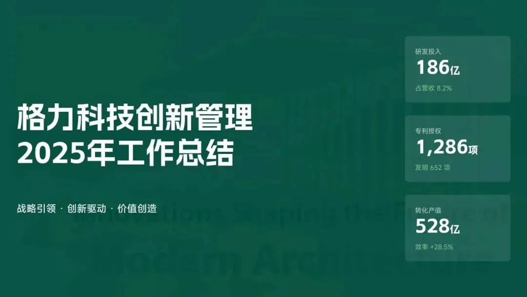 格力电器2025年科技创新管理部紧紧围绕集团“核心技术自主可控、创新体系协同高效、成果转化提质增效”核心科技战略,统筹推进核心技术研发、创新体系优化、科技成果转化、产学研协同创新、创新人才培育五大核心工作,全年科技研发投入达186亿元,占营收比重8.2%(同比提升1.3个百分点);累计突破核心技术瓶颈42项,其中全球领先技术8项;新增专利授权1286项(发明专利652项),专利保有量达9860项;科技成果转化产值达528亿元,转化效率同比提升28.5%;成功牵头或参与制定国家/行业标准15项,顺利通过国家级企业技术中心复核,为集团全品类产品迭代升级、市场竞争力提升筑牢了坚实的科技支撑。现将全年工作情况总结如下,并对2026年工作作出全面规划。