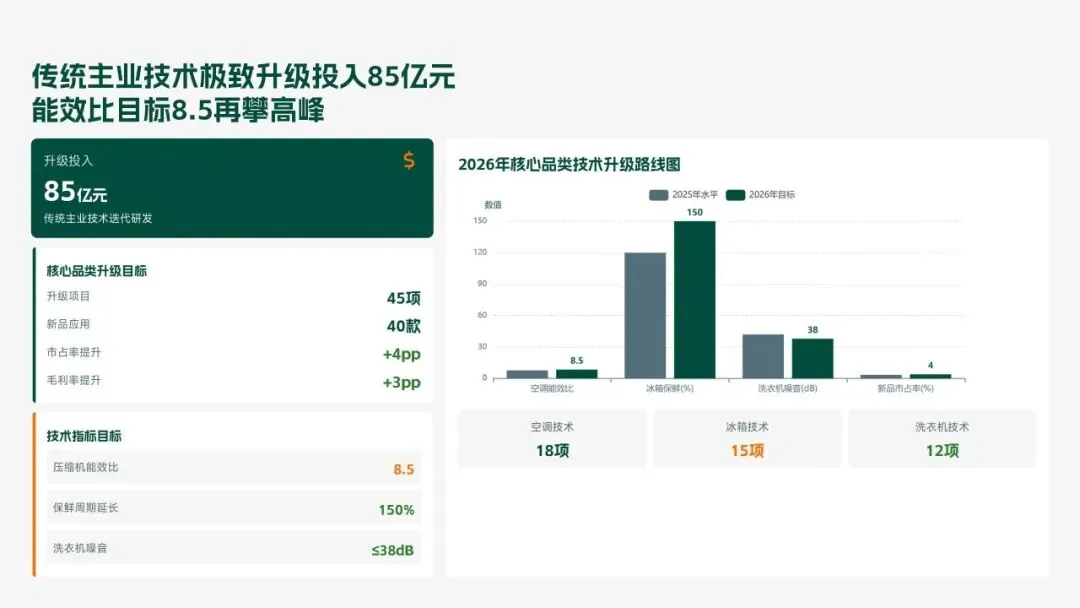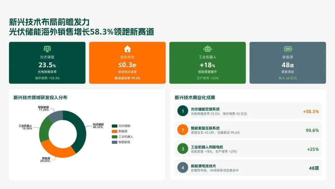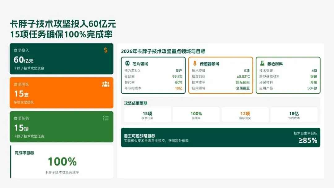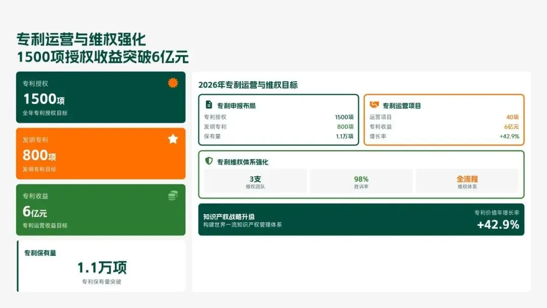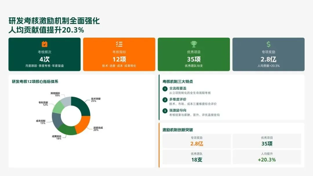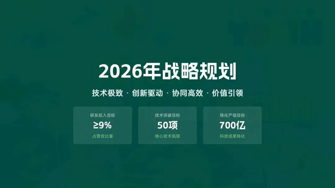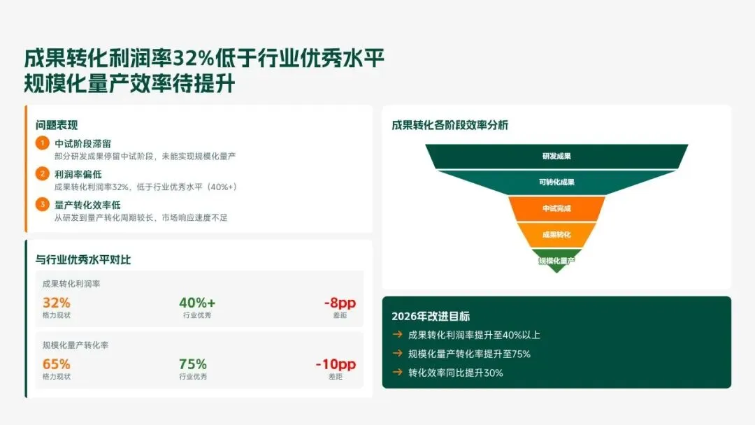 格力电器2025年科技创新管理部紧紧围绕集团“核心技术自主可控、创新体系协同高效、成果转化提质增效”核心科技战略,统筹推进核心技术研发、创新体系优化、科技成果转化、产学研协同创新、创新人才培育五大核心工作,全年科技研发投入达186亿元,占营收比重8.2%(同比提升1.3个百分点);累计突破核心技术瓶颈42项,其中全球领先技术8项;新增专利授权1286项(发明专利652项),专利保有量达9860项;科技成果转化产值达528亿元,转化效率同比提升28.5%;成功牵头或参与制定国家/行业标准15项,顺利通过国家级企业技术中心复核,为集团全品类产品迭代升级、市场竞争力提升筑牢了坚实的科技支撑。现将全年工作情况总结如下,并对2026年工作作出全面规划。
