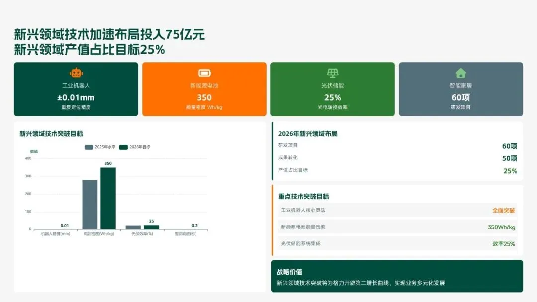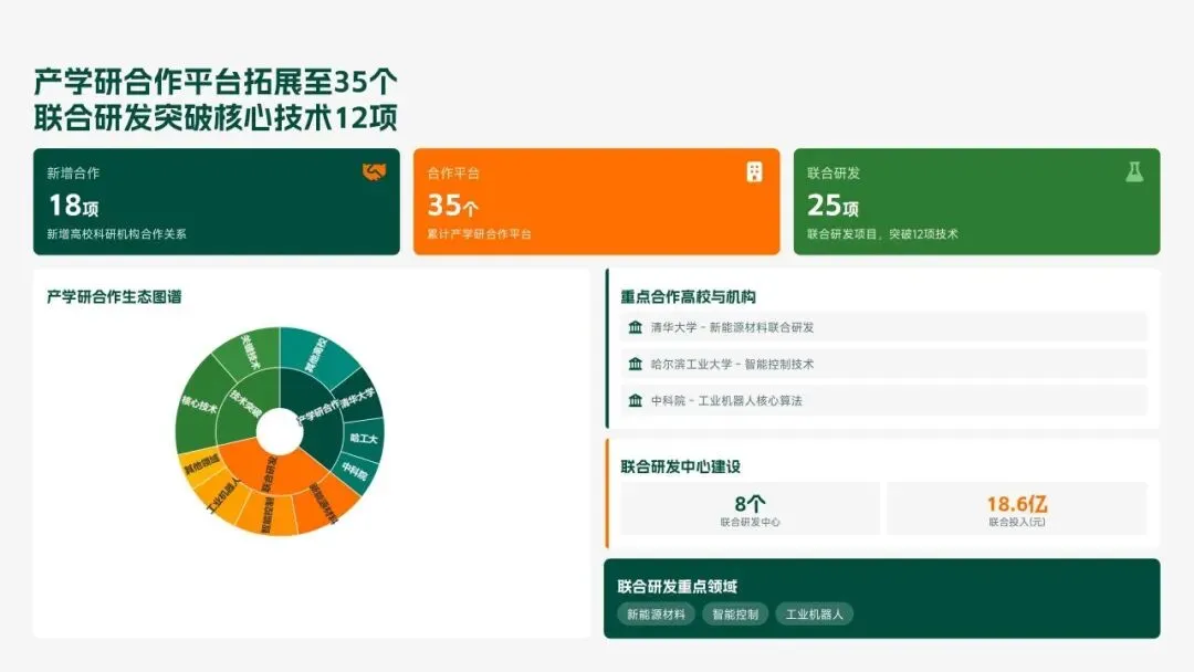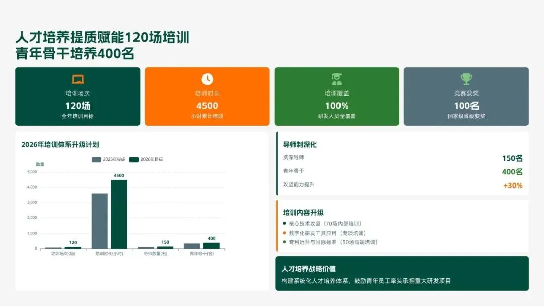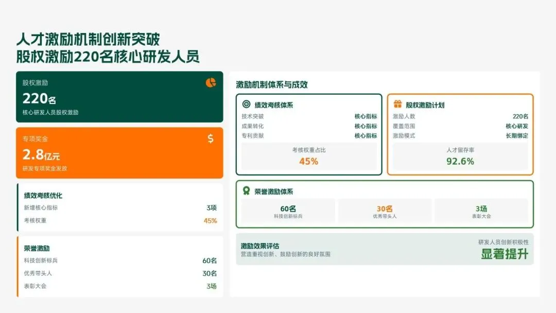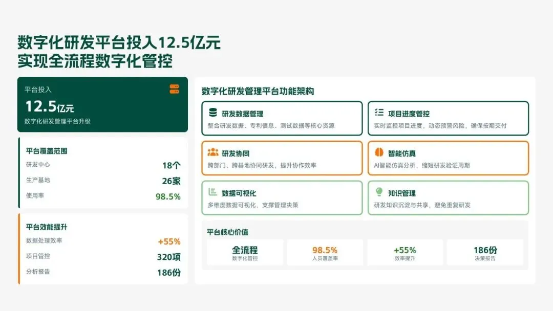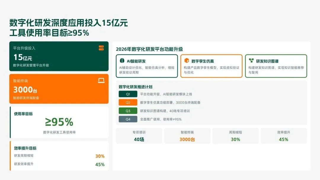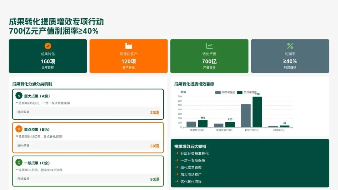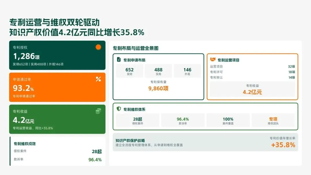 格力电器2025年科技创新管理部紧紧围绕集团“核心技术自主可控、创新体系协同高效、成果转化提质增效”核心科技战略,统筹推进核心技术研发、创新体系优化、科技成果转化、产学研协同创新、创新人才培育五大核心工作,全年科技研发投入达186亿元,占营收比重8.2%(同比提升1.3个百分点);累计突破核心技术瓶颈42项,其中全球领先技术8项;新增专利授权1286项(发明专利652项),专利保有量达9860项;科技成果转化产值达528亿元,转化效率同比提升28.5%;成功牵头或参与制定国家/行业标准15项,顺利通过国家级企业技术中心复核,为集团全品类产品迭代升级、市场竞争力提升筑牢了坚实的科技支撑。现将全年工作情况总结如下,并对2026年工作作出全面规划。