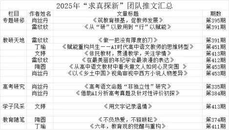 (2)高考研究深度化:如“求真探新”团队肖丝丹的《借助AI分析高考真题及针对性评价初探》;“爨景”团队董安然的《语言文字运用中的命题趋势》,数据详实,分析入微,为一线教师备考提供了很好的参考。