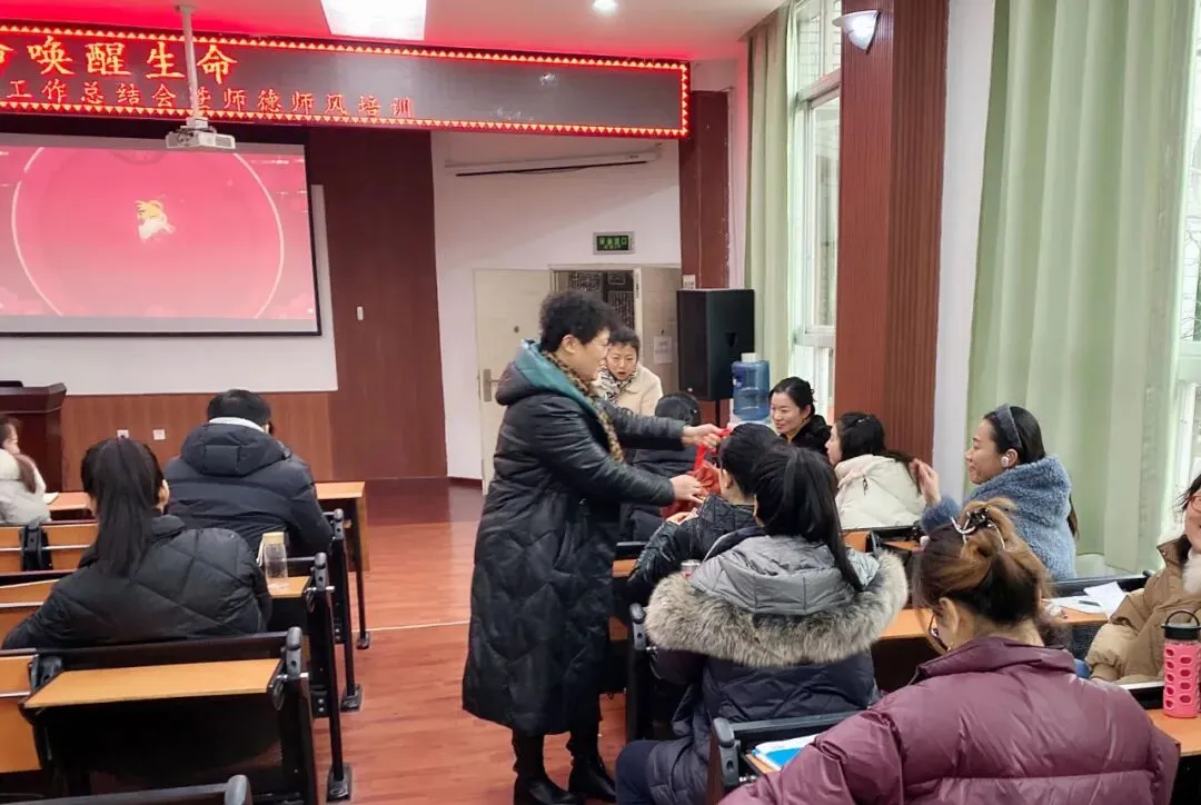 学校党支部书记李秀蓉在总结会上以“做个快乐的加水人”为主题,对全体教师进行了师德师风专题培训。