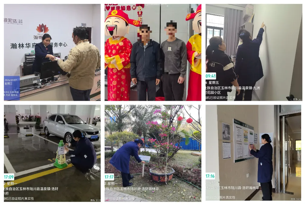 日常秩序维护,秩序部24小时的轮岗巡查,来访人员登记、违停车辆管理、消防器材检查,每日完成对小区花园、商铺、楼层天台、治安隐患巡查签到,上门处理临时问题等。