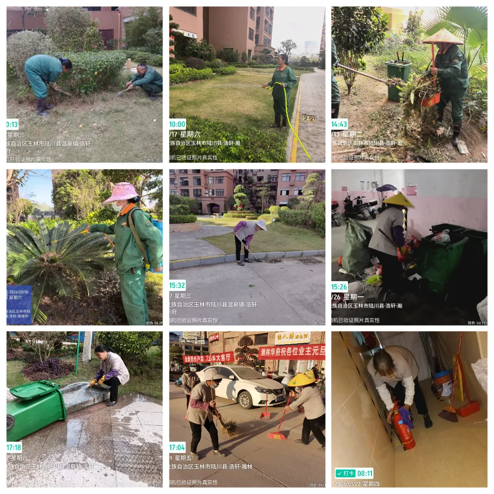 我们完成了楼宇公共区域拖扫、沿街路面清扫、垃圾桶清洗、消防设施清洁、天花蜘蛛网清理、采光井垃圾清扫、地下停车场清扫、园区/地下室地面冲洗、园林绿化对区高枝修剪,绿篱造型修剪,裸土补种,日常浇水,施肥,除杂草,清扫枯枝落叶,完成了每月一次四害蚊虫消杀等。