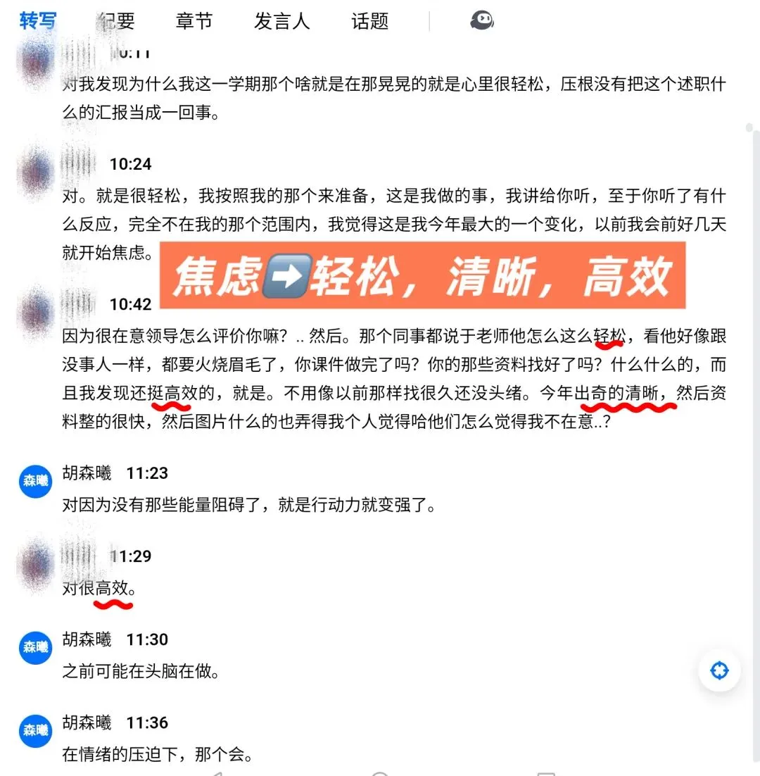 这次准备述职,Y老师甚至完全没有触发焦虑情绪——长期练习让她早已跳出“内耗陷阱”,全程以平和的心态列出工作成果、梳理述职逻辑,连找资料、做PPT的过程都顺畅高效。站在述职台上时,她也没有想领导会怎么看,而是专注地分享自己的工作思考,这种“向内看”的从容,反而让她的表达更有力量。