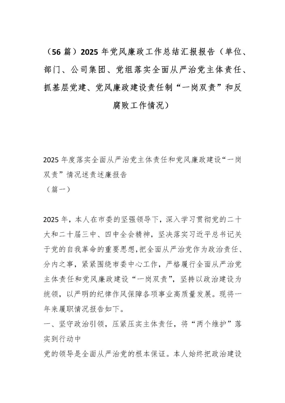 (56篇)2025年党风廉政工作总结汇报报告(单位、部门、公司集团、党组落实全面从严治党主体责任、抓基层党建、党风廉政建设责任制“一岗双责”和反腐败工作情况)