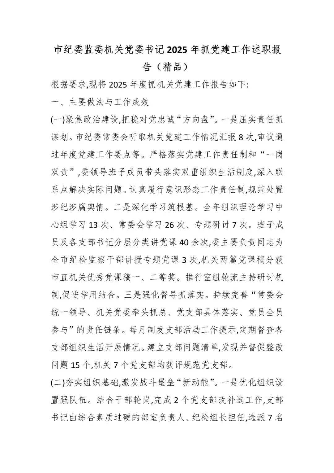 市纪委监委机关党委书记2025年抓党建工作述职报告(精品)