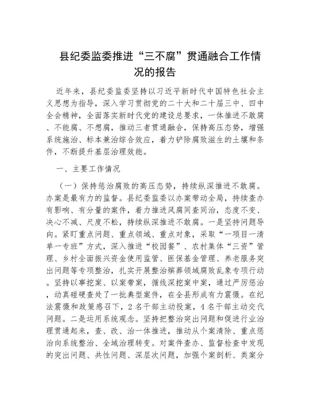 >县纪委监委推进“三不腐”贯通融合工作情况的报告