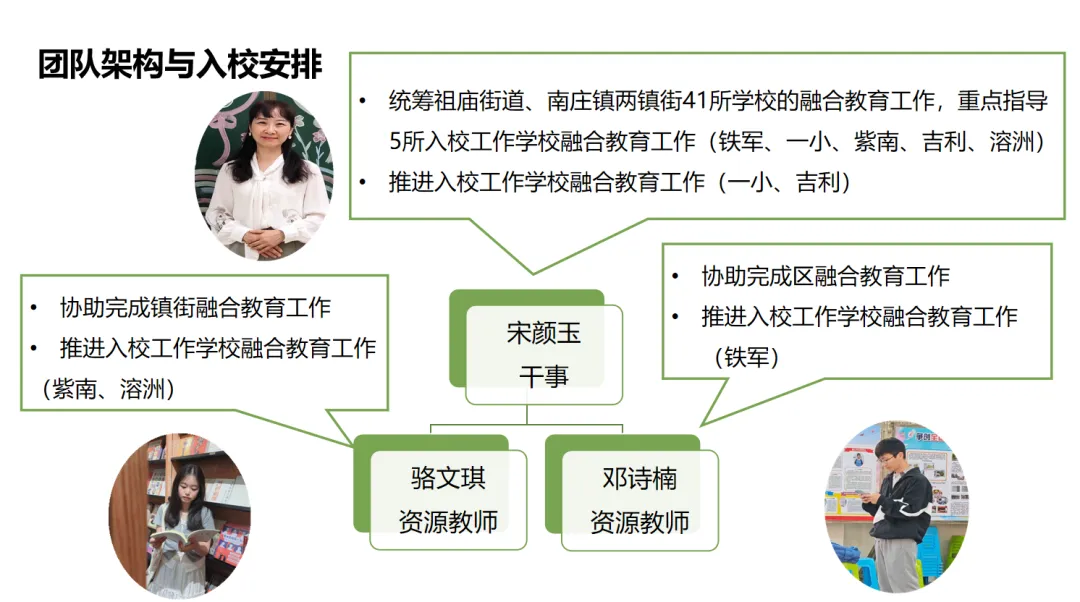 融合教育发展统筹干事宋颜玉与组内两名资源教师共同负责祖庙街道、南庄镇两个镇街的融合教育工作。