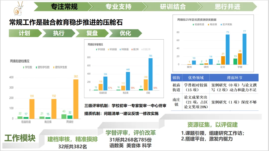 本学期为32所学校的382名特需生建立规范档案;对31所学校268名二级及以上建档学生的785份学替进行评审,覆盖语文、数学、英语、美术、音乐、体育、科学7个学科,在三级评审机制的“专家复审”阶段两镇街通过率均超区通过率,针对不通过的学替方案,形成“问题清单、建议反馈、修改实施”的提质机制,严把质量关;对两镇街的2025年区优质资源获奖数据进行优劣势分析,祖庙学替相对较强(15项),但案例(0项)、论文(2项)撰写动力和研究能力不足,南庄镇论文成果突出(21项,占区论文奖项28%),案例研究(1项,二等奖)深度不够;可从课题研究,组建研究工作坊;搭建平台,激发内驱力作为改进方向。