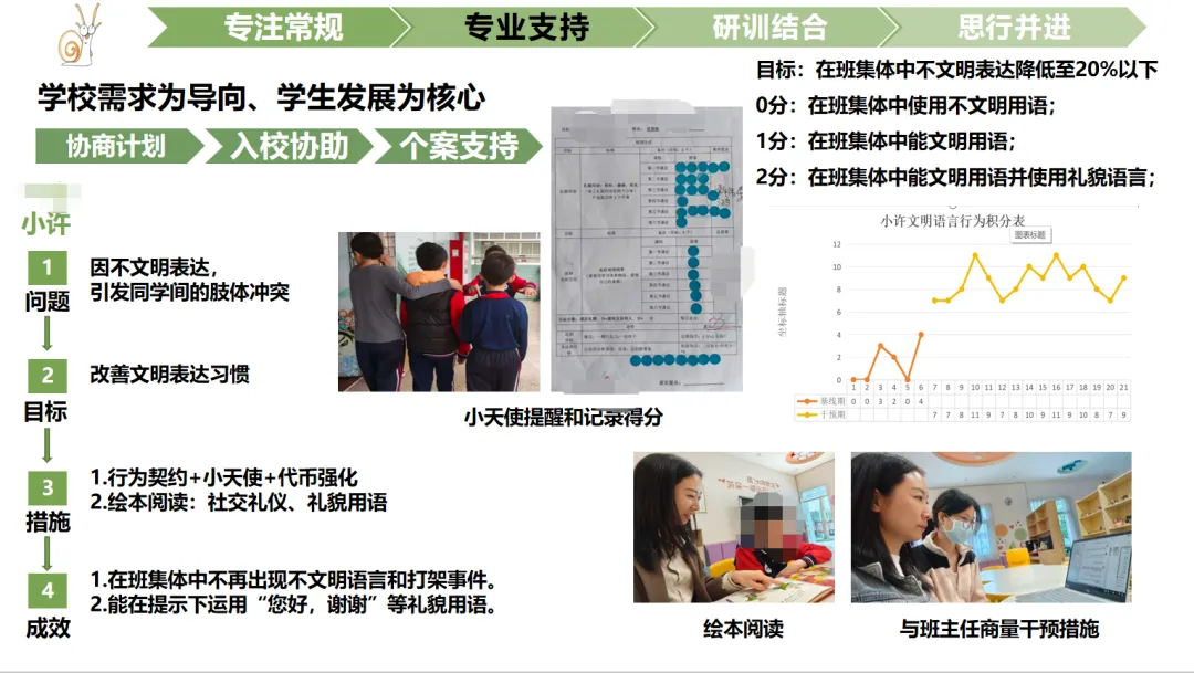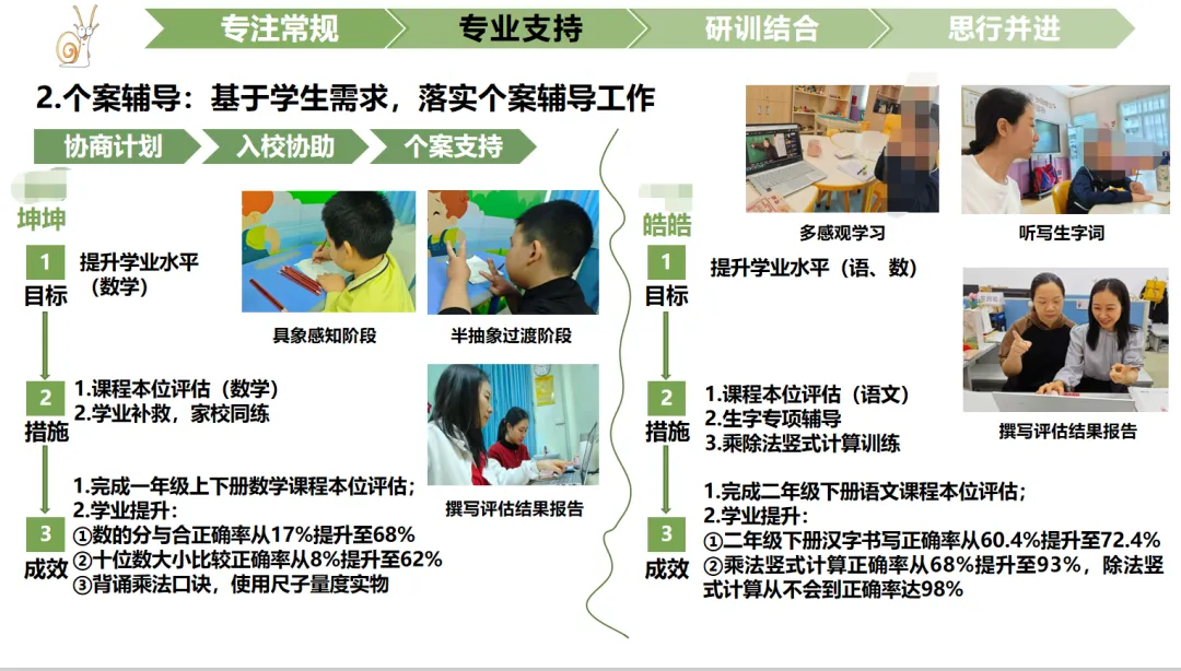 如本人负责的某驻点学校坤坤(化名),通过课程本位评估、学业补救、家校同步练习等措施,数学学业水平显著提升;本人负责的某驻点学校小许(化名),通过行为契约、小天使团、代币强化、绘本教学等方式,改善了文明表达习惯。
