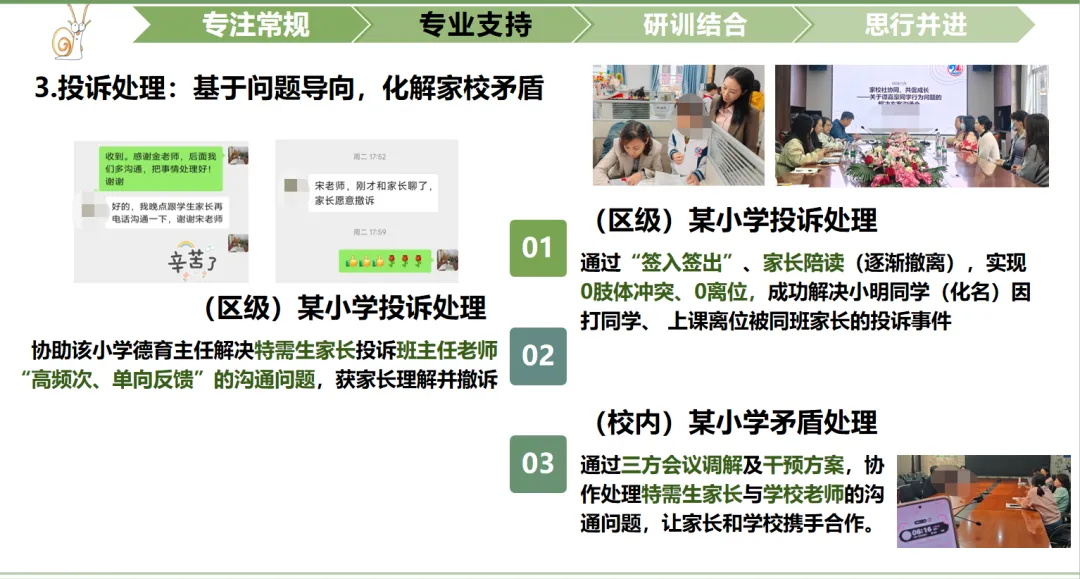 如成功化解负责镇街某小学小明同学(化名)因攻击同学、上课离位被同班家长投诉,通过“签入签出”家长陪读从全陪到逐步撤离,实现0冲突、0离位,令家校满意;协助负责镇街某小学主任处理特需生家长投诉班主任长期“高频次、单向反馈”的沟通问题,获得家长理解并撤诉。