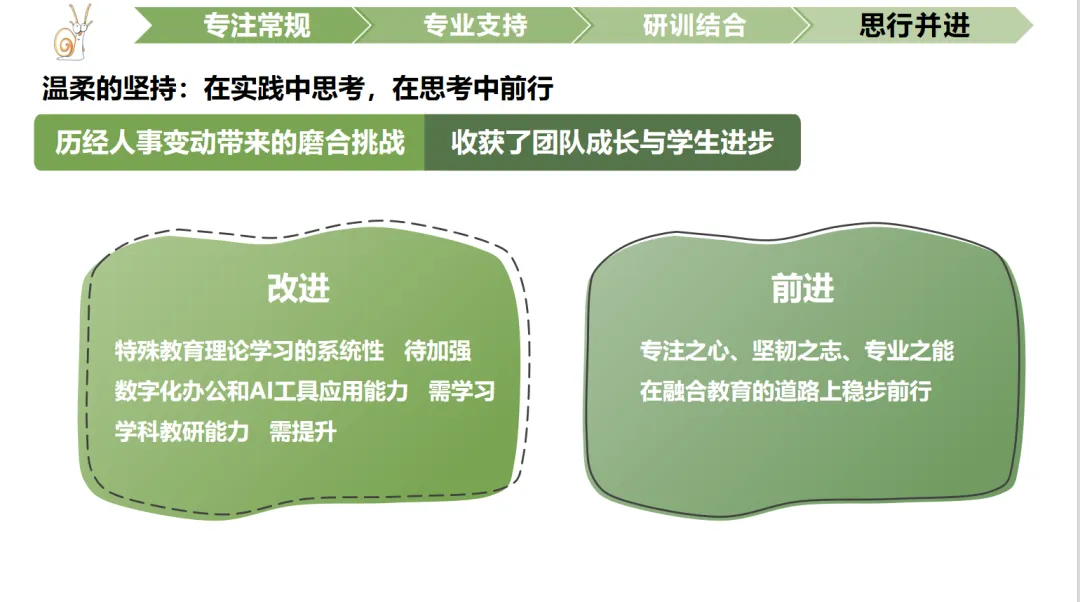 融合教育是一场温柔的坚持,需要在实践中思考,在思考中前行。本学期,我经历了人事变动带来的磨合挑战,也收获了团队成长与学生进步的喜悦。同时反思不足,有三方面需要改进:特殊教育理论学习的系统性待加强,数字化办公与AI工具应用能力需学习,学科教研能力需提升。
