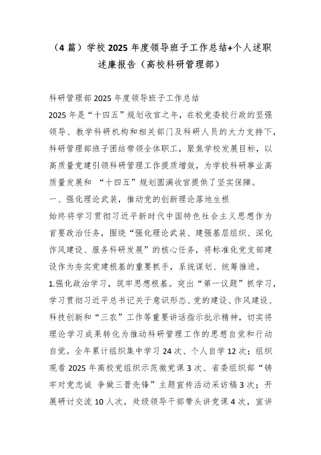 >(4篇)学校2025年度领导班子工作总结+个人述职述廉报告(高校科研管理部)