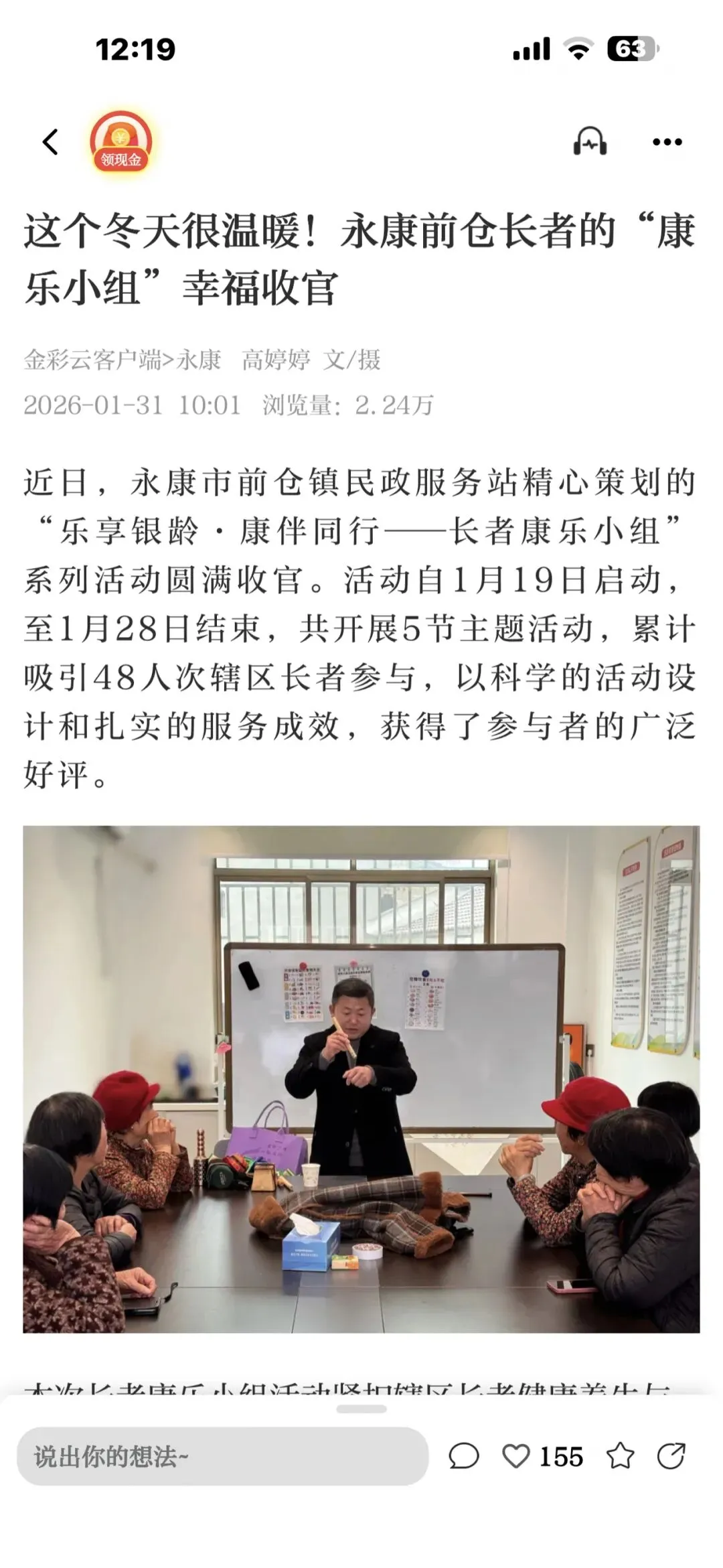 (二)1月23日联合永康市专业社工和志愿服务联合会、后吴村妇联及多家医疗机构开展 深入后吴村开展“耆乐融融服务到家” 便民敬老活动,为长者提供理发、足部护理、视力检测、白内障筛查、口腔检查、听力检测、肩颈按摩等服务,累计服务 215 人次,解决老年群体 “出行难、办事难” 问题。