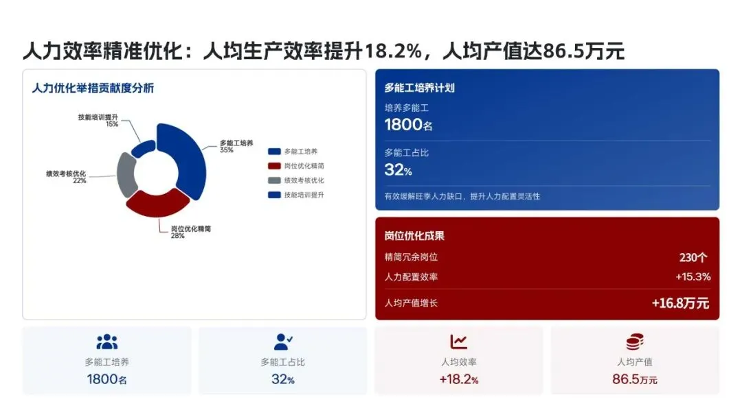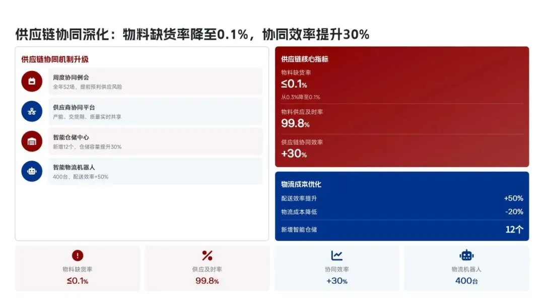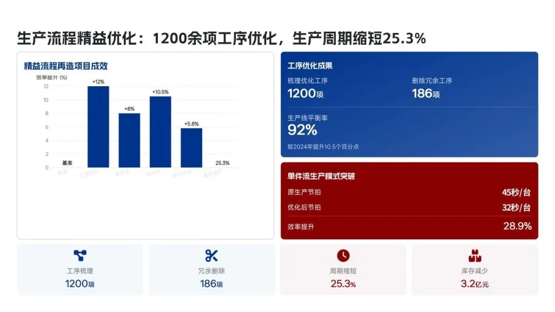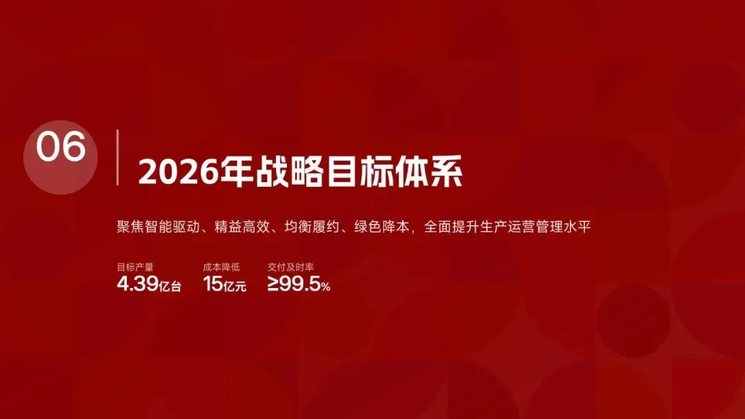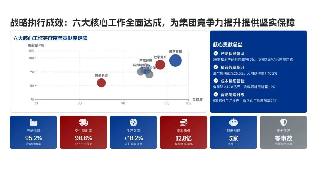 美的集团生产管理部在2025年紧密围绕“科技驱动、精益制造、高效履约、绿色低碳”的核心战略,全面完成了年度生产目标。全年总产量达到3.82亿台,同比增长12.5%,生产交付及时率提升至98.6%,人均生产效率提高了18.2%。通过全面推行精益生产和智能化升级,例如打造5家智能标杆工厂和完成28家生产基地的绿色改造,实现了生产总成本降低12.8亿元,生产过程一次合格率提升至99.3%。在供应链协同方面,物料缺货率控制在0.3%,并通过数字化平台高效处理了126万笔订单,确保了产能利用率高达95.2%。这些成效得益于MBS精益管理体系的全面覆盖和海外复制,以及泰国空调超级灯塔工厂“每6秒下线一台空调”的卓越效率。