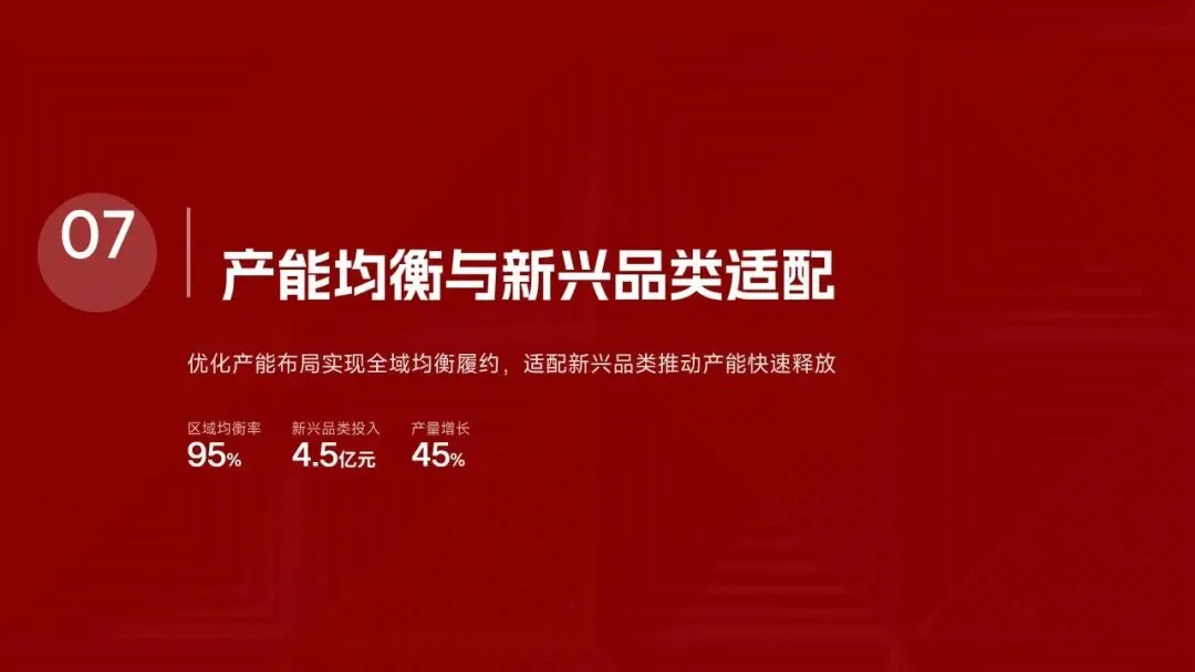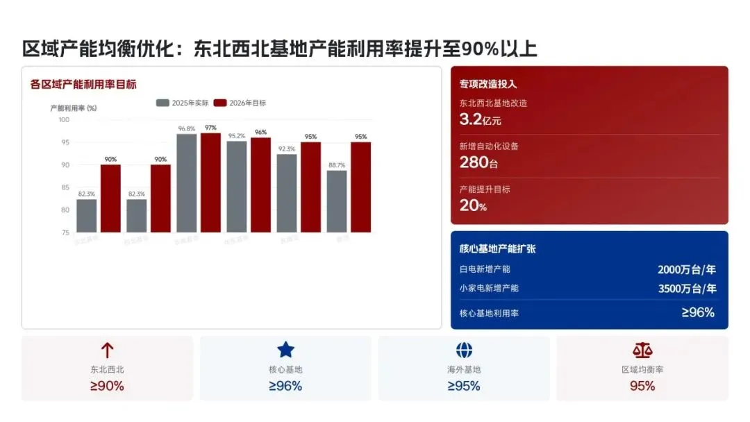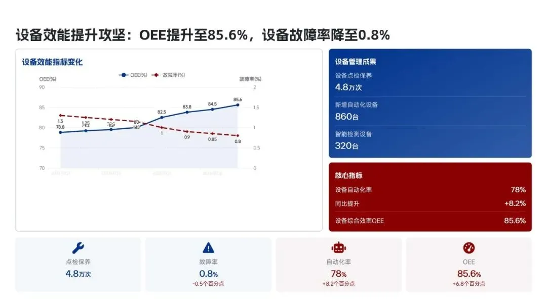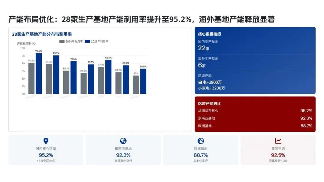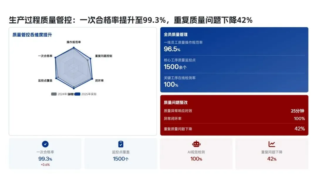 美的集团生产管理部在2025年紧密围绕“科技驱动、精益制造、高效履约、绿色低碳”的核心战略,全面完成了年度生产目标。全年总产量达到3.82亿台,同比增长12.5%,生产交付及时率提升至98.6%,人均生产效率提高了18.2%。通过全面推行精益生产和智能化升级,例如打造5家智能标杆工厂和完成28家生产基地的绿色改造,实现了生产总成本降低12.8亿元,生产过程一次合格率提升至99.3%。在供应链协同方面,物料缺货率控制在0.3%,并通过数字化平台高效处理了126万笔订单,确保了产能利用率高达95.2%。这些成效得益于MBS精益管理体系的全面覆盖和海外复制,以及泰国空调超级灯塔工厂“每6秒下线一台空调”的卓越效率。