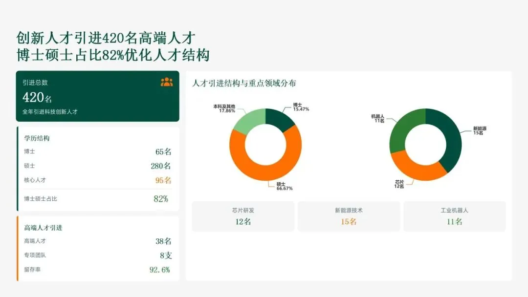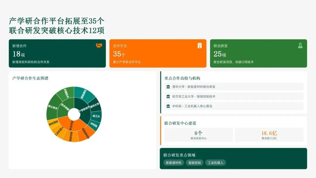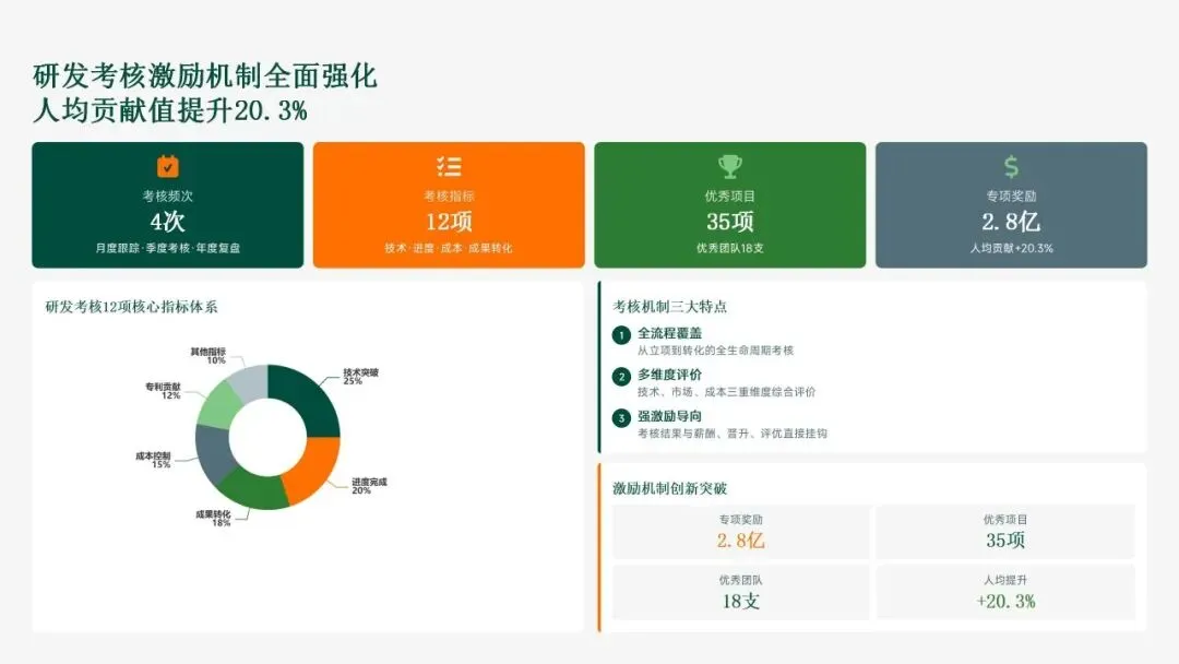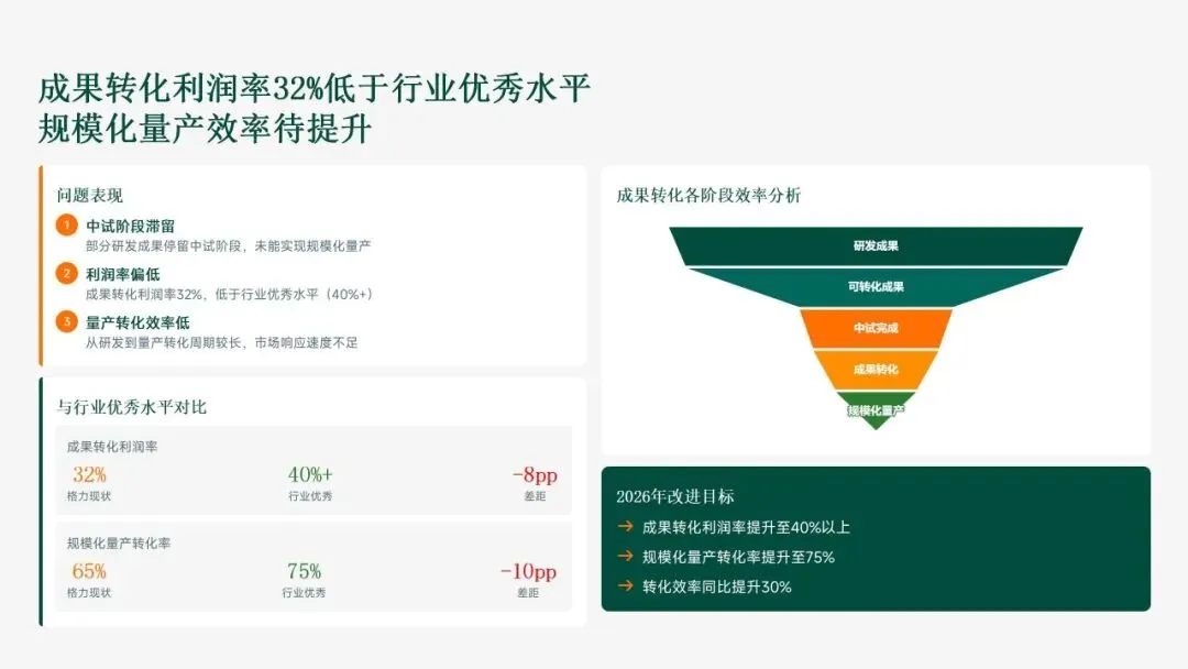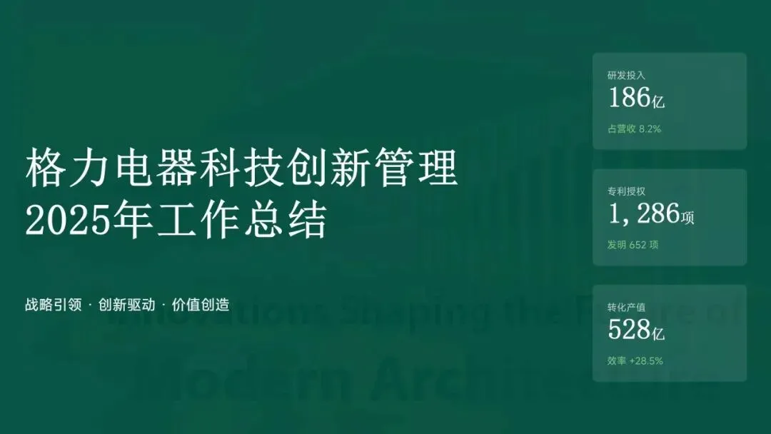 在创新管理方面,格力电器通过37项制度构建标准化框架,数字化研发平台覆盖18个中心,研发周期缩短22%。成果转化平台高效运作,128项成果中18项产值超10亿元,产学研合作拓展至35个平台,联合研发突破12项核心技术。人才引进420名高端人才(博士硕士占比82%),培训3600小时,人均贡献值提升20.3%。尽管成果丰硕,公司也识别出新兴领域进度不均衡、成果转化深度不足等短板,为2026年规划提供改进方向。总体而言,2025年的科技创新工作为格力电器奠定了技术极致化基础,并为未来增长注入新动能。