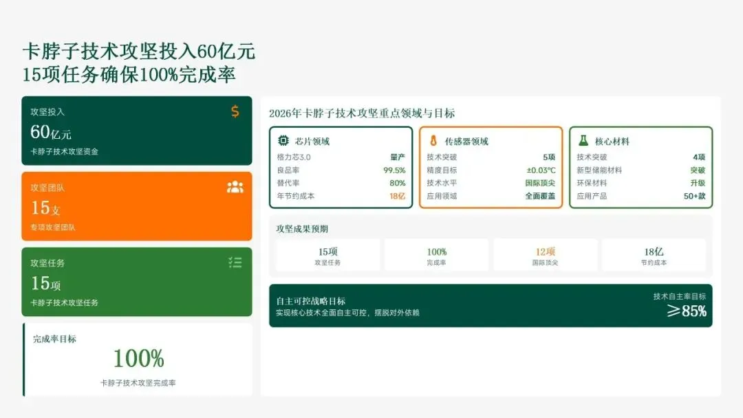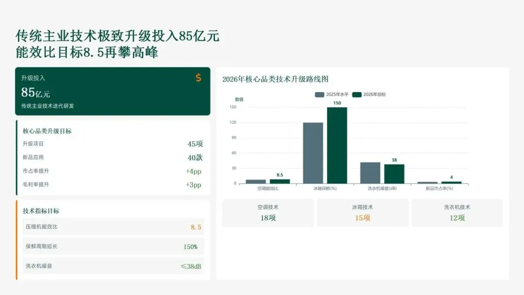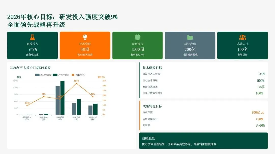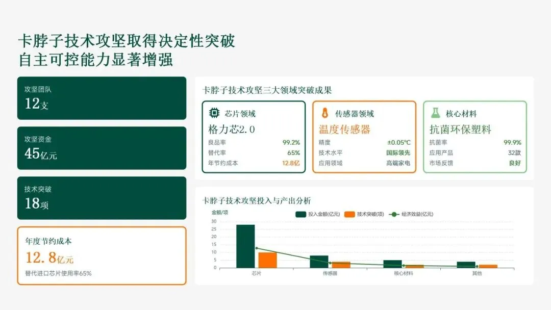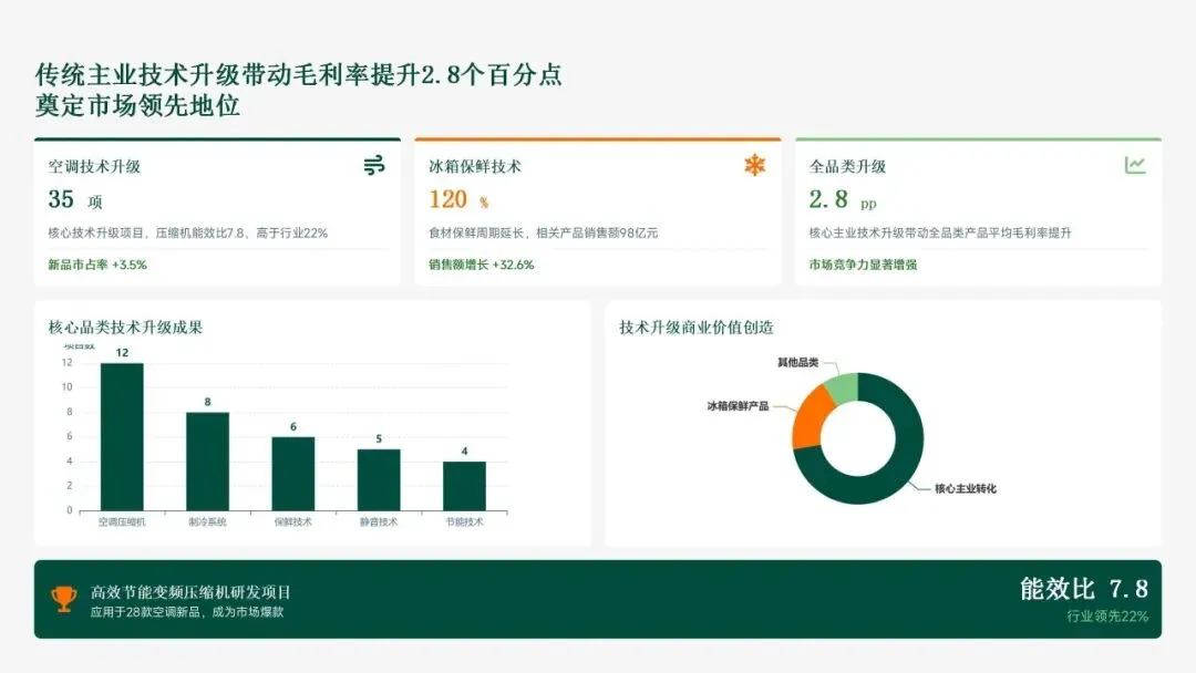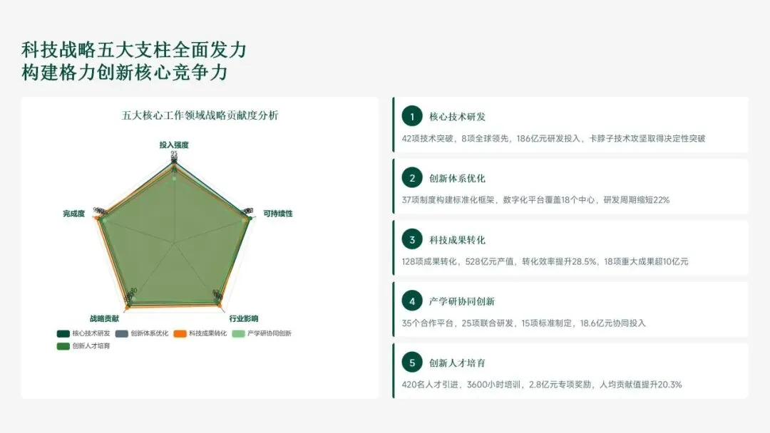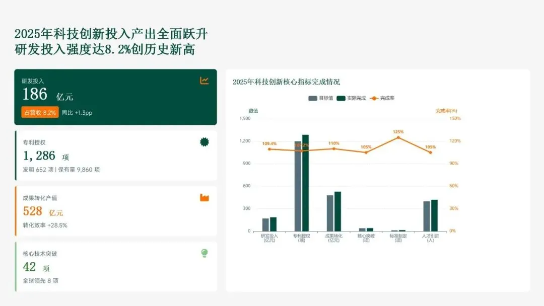 格力电器在2025年坚持以“战略引领·创新驱动·价值创造”为核心,科技创新工作实现全面跃升。研发投入强度创历史新高,达186亿元,占营收比重8.2%,带动专利授权1,286项(其中发明652项),科技成果转化产值528亿元,转化效率提升28.5%。通过五大战略支柱——核心技术研发、创新体系优化、科技成果转化、产学研协同创新和创新人才培育——的协同发力,公司构建了强大的创新核心竞争力。传统主业技术升级成效显著,空调、冰箱等核心品类实现35项技术升级,压缩机能效比达7.8(高于行业22%),新品市占率提升3.5个百分点,全品类毛利率提升2.8个百分点,市场领先地位进一步巩固。同时,卡脖子技术攻坚取得决定性突破,在芯片、传感器和核心材料领域实现18项技术自主化,年节约成本12.8亿元,替代进口芯片使用率达65%,自主可控能力显著增强。