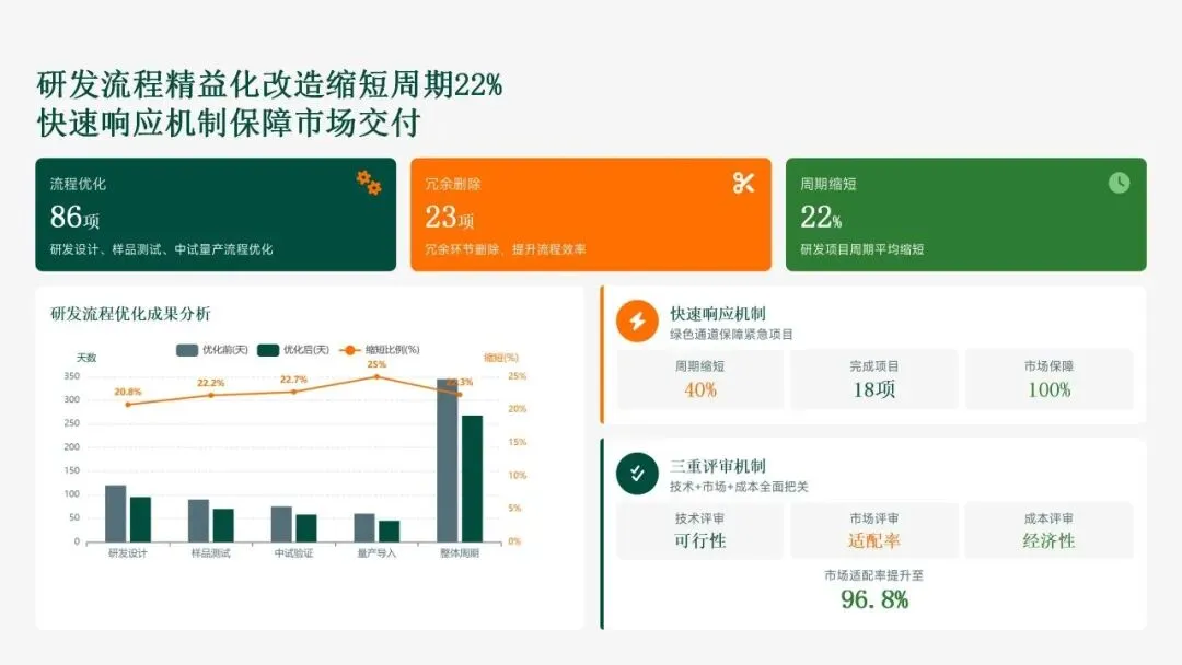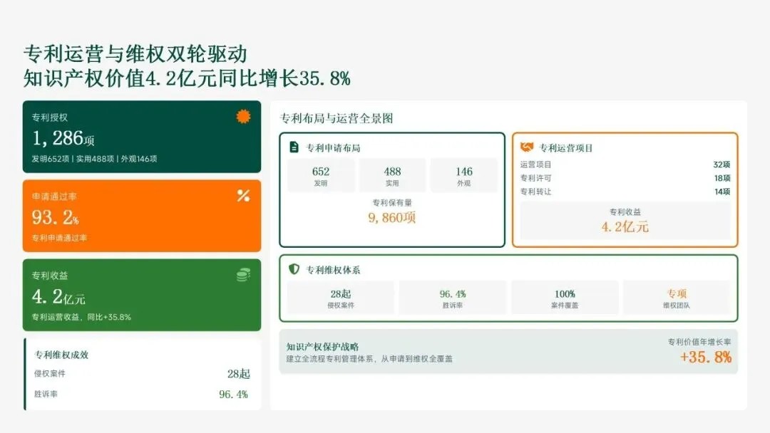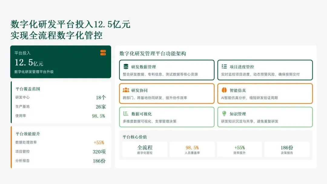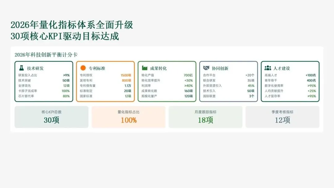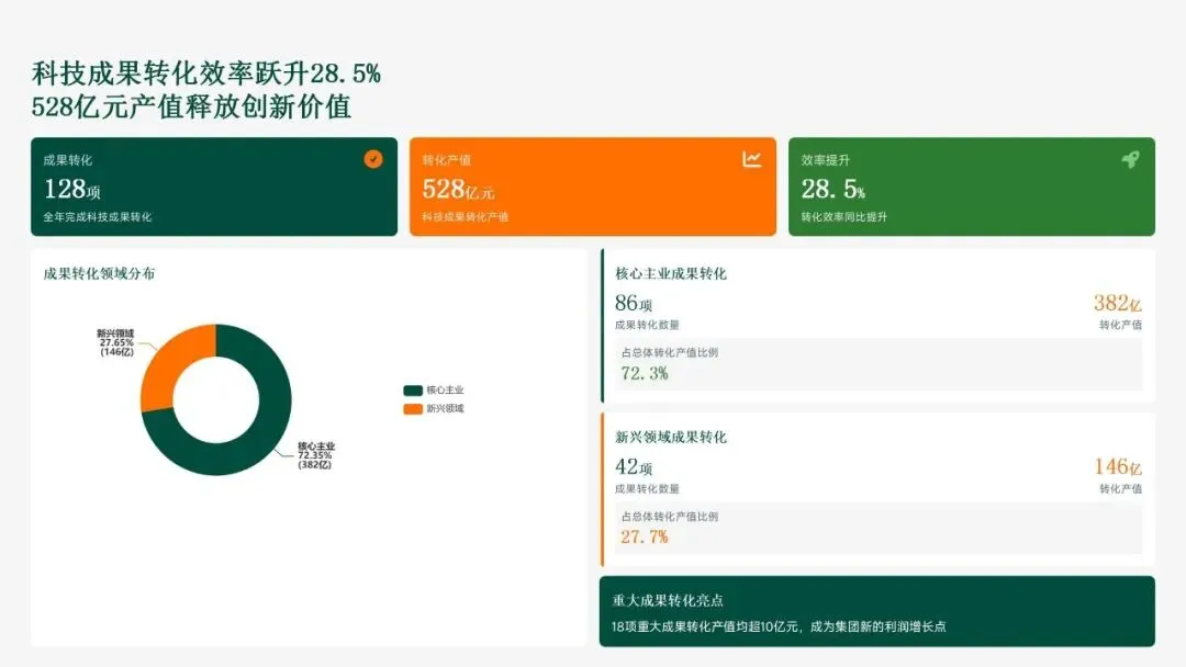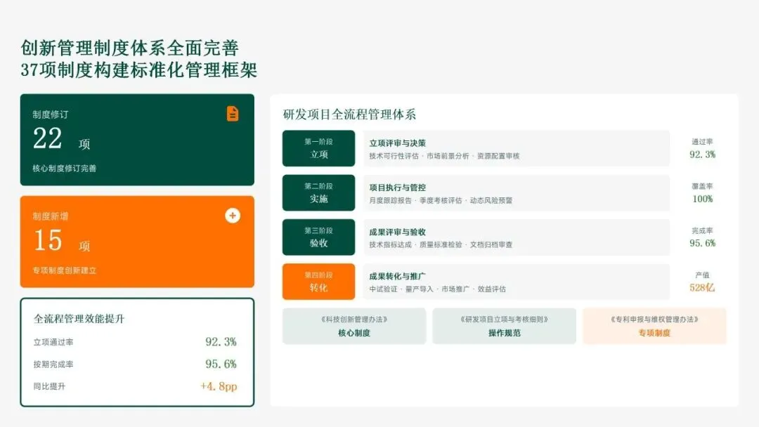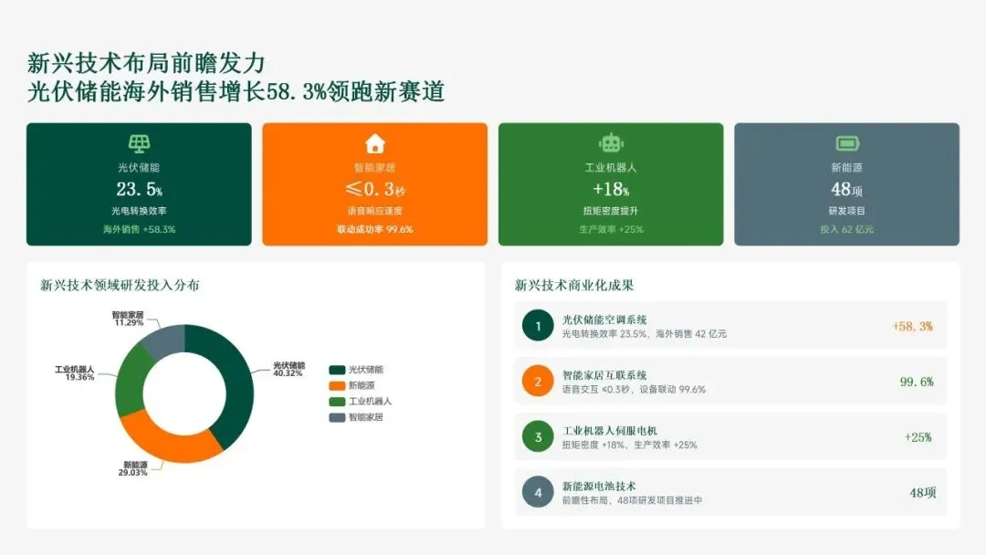 格力电器在2025年坚持以“战略引领·创新驱动·价值创造”为核心,科技创新工作实现全面跃升。研发投入强度创历史新高,达186亿元,占营收比重8.2%,带动专利授权1,286项(其中发明652项),科技成果转化产值528亿元,转化效率提升28.5%。通过五大战略支柱——核心技术研发、创新体系优化、科技成果转化、产学研协同创新和创新人才培育——的协同发力,公司构建了强大的创新核心竞争力。传统主业技术升级成效显著,空调、冰箱等核心品类实现35项技术升级,压缩机能效比达7.8(高于行业22%),新品市占率提升3.5个百分点,全品类毛利率提升2.8个百分点,市场领先地位进一步巩固。同时,卡脖子技术攻坚取得决定性突破,在芯片、传感器和核心材料领域实现18项技术自主化,年节约成本12.8亿元,替代进口芯片使用率达65%,自主可控能力显著增强。