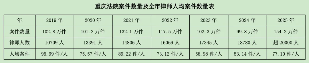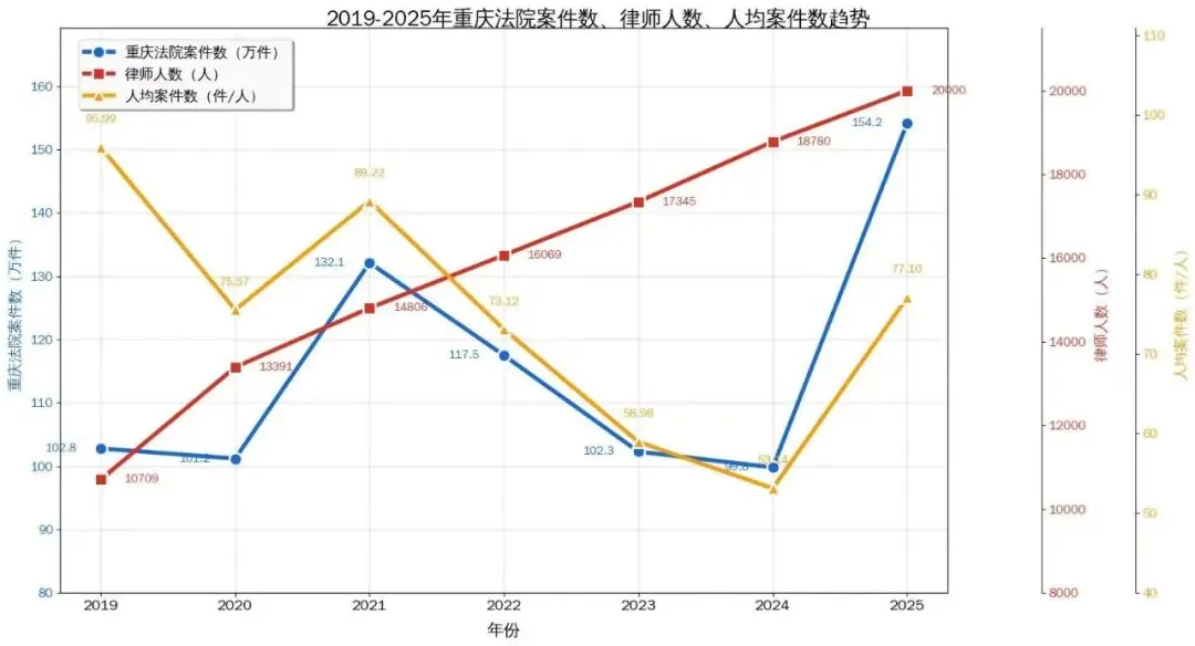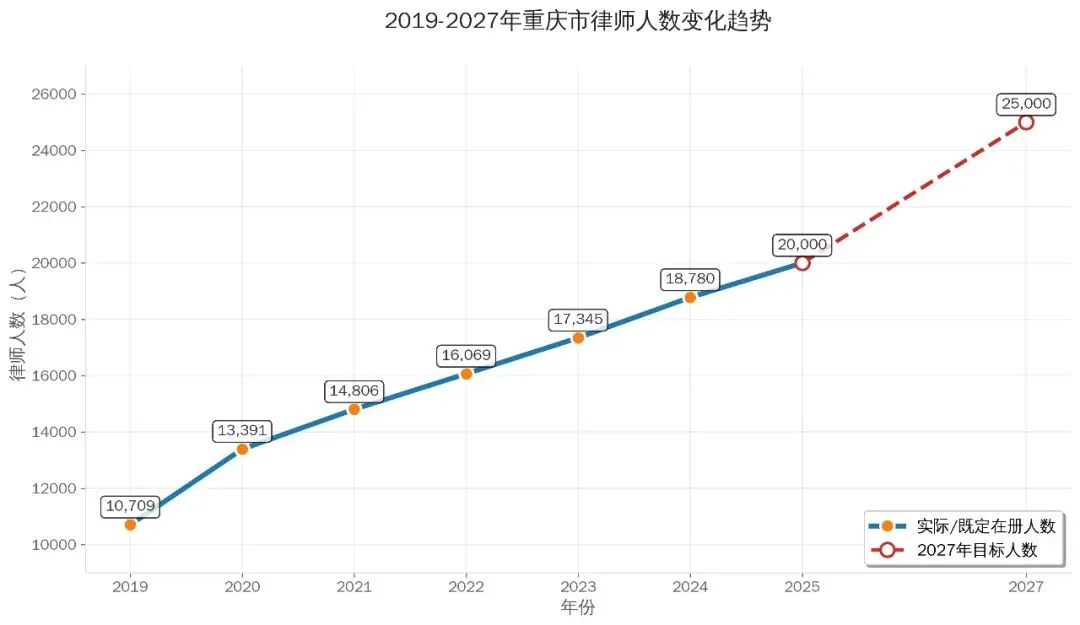 经查阅重庆市律师人数,2019年全市律师10709人,2020年全市律师13391人,2021年全市律师14806人,2022年年末全市律师16069人,2023年年末全市律师17345人,2024年年末全市律师18780人,2025年年末全市律师超过了20000人。根据《重庆律师行业第四个发展规划纲要(2024—2027年)》,到2027年,全市律师人数将达25000人以上。