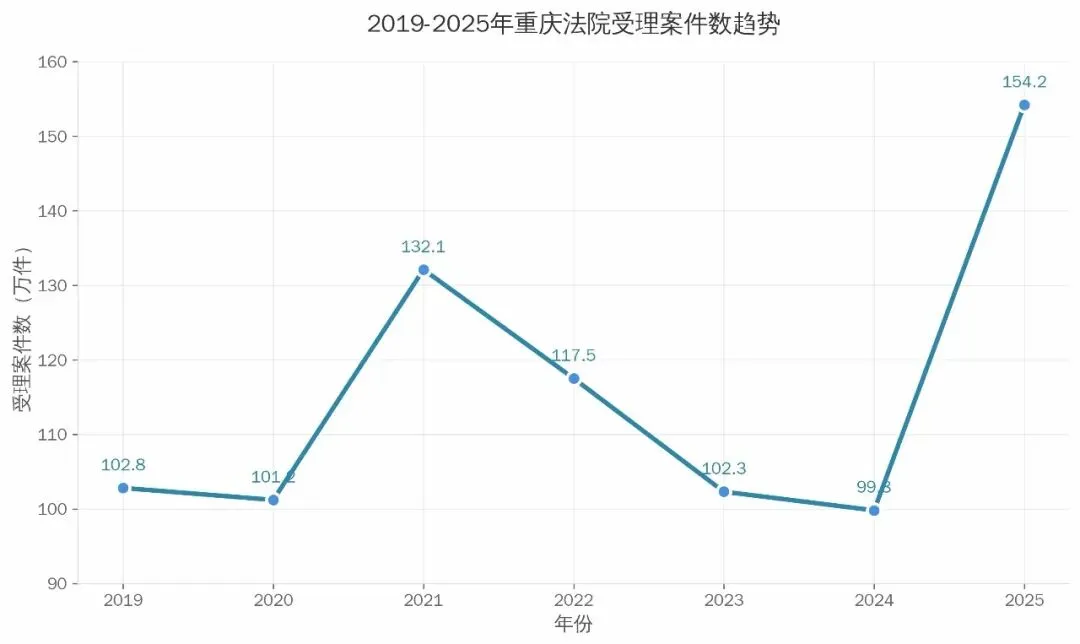 2026年1月29日,在重庆市第六届人民代表大会第四次会议第二次全体会议上,重庆市高级人民法院院长李永利作了《重庆市高级人民法院工作报告》。根据该报告,2025年全市法院收案154.2万件。